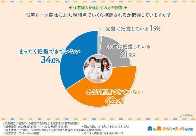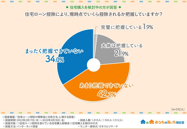 そこで、「住宅ローン控除により、現時点でいくら控除されるか把握していますか?」と質問したところ、7割以上の方が『あまり把握できていない(42.2%)』『まったく把握できていない(34.0%)』と回答しました。
