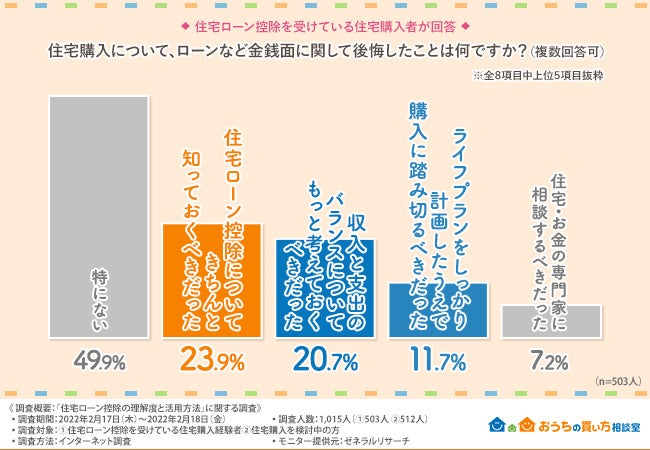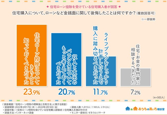 「住宅購入について、ローンなど金銭面に関して後悔したことは何ですか?(複数回答可)」と質問したところ後悔した方の回答に注目すると『住宅ローン控除についてきちんと知っておくべきだった(23.9%)』と回答した方が最も多く、次いで『収入と支出のバランスについてもっと考えておくべきだった(20.7%)』『ライフプランをしっかり計画したうえで購入に踏み切るべきだった(11.7%)』と、続きました。