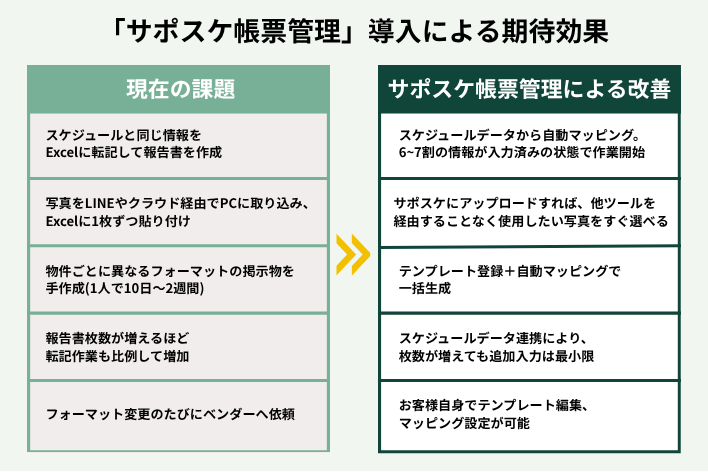 従来の業務フローとサポスケ帳票管理導入後の変化については、上図の通りです。スケジュール・写真・帳票が分断されていた従来の運用に対し、本サービスではすべての情報が一元化されることで、入力ミスや作業工数の大幅な削減が実現します(図参照)。