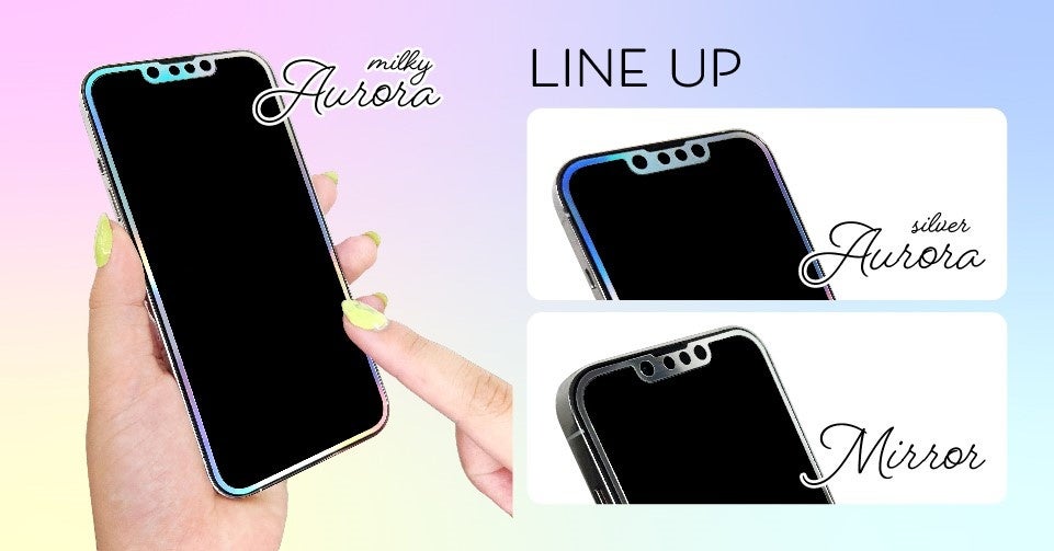 そういった"韓国ブーム"に注目した株式会社サンクレストは、36年間培ってきた技術を元に、ガラスフィルムのフレームカラーを「黒」から「オーロラ」と「ミラー」へ変更。フレームがワンポイントに目立つオシャレで華やかなスマートフォンへ変身します。