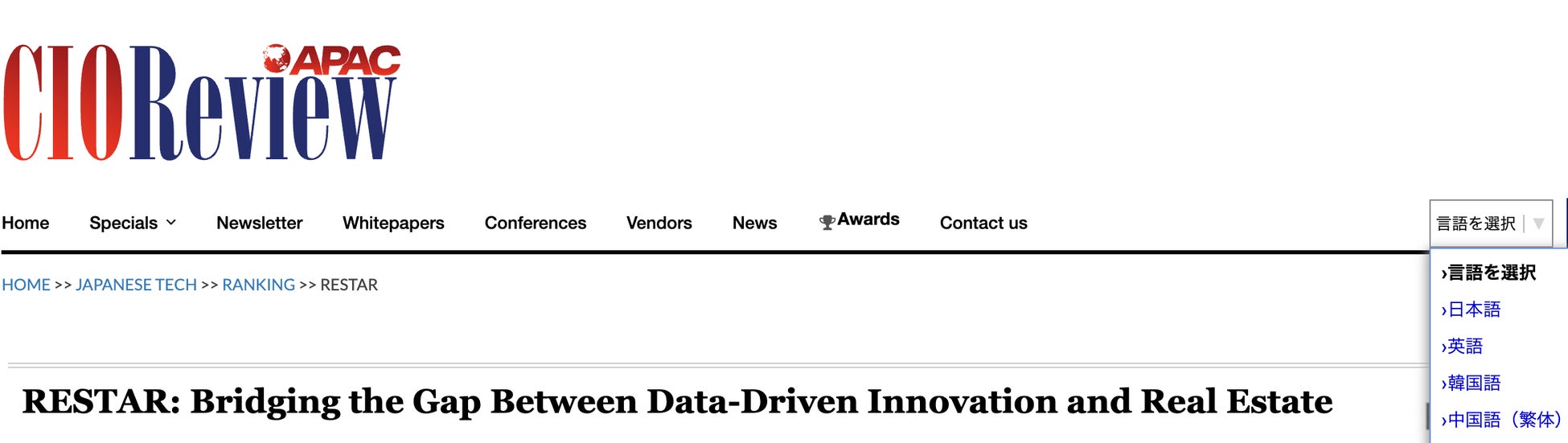 RESTAR、 IT専門誌「CIOReview APAC」より、最も有望な日本のテックカンパニーTOP20としてAwardを受賞