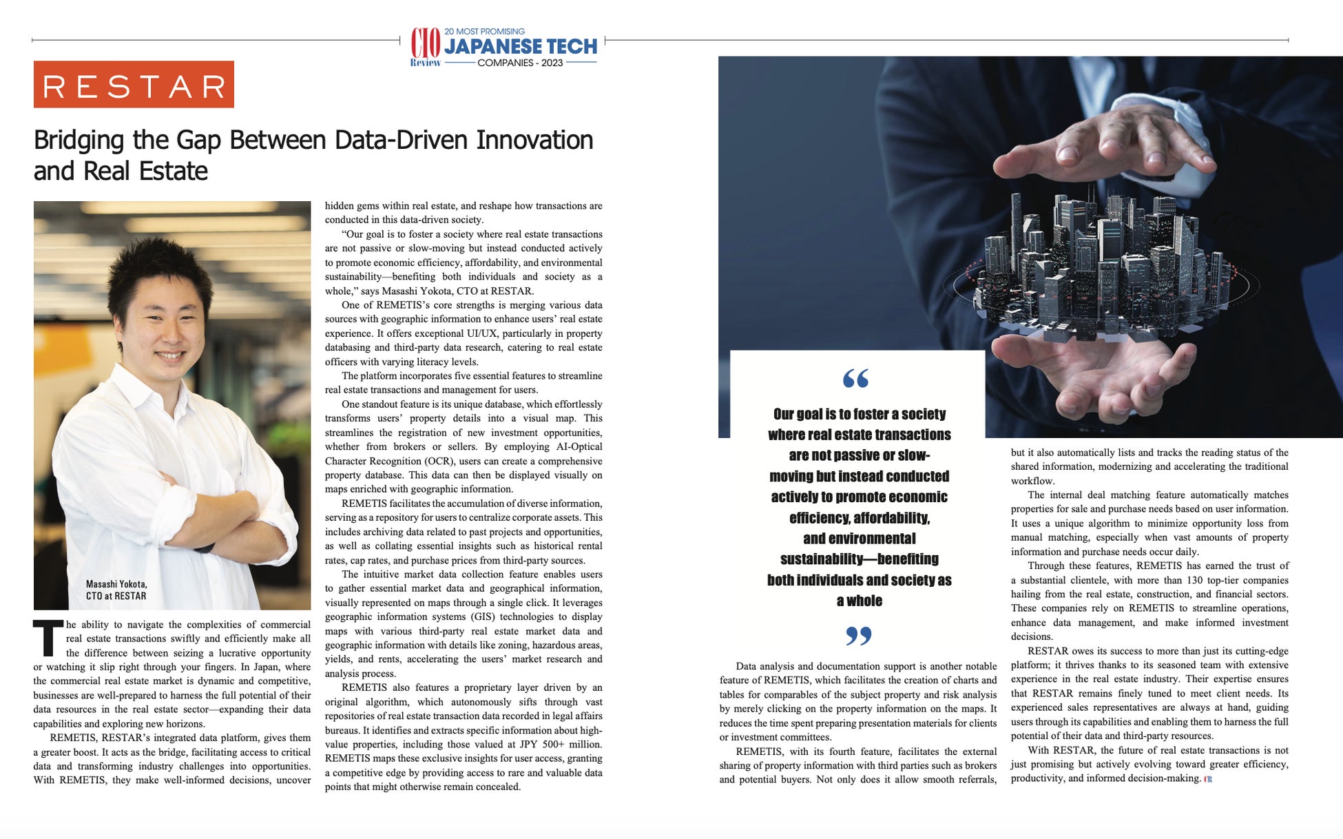 特に、RESTARが開発・提供する不動産・地理情報の管理分析プラットフォーム「REMETIS」が事業用不動産業務の効率を向上させる統合データプラットフォームとして、CIO Reviewパネリストより高い評価を受けました。