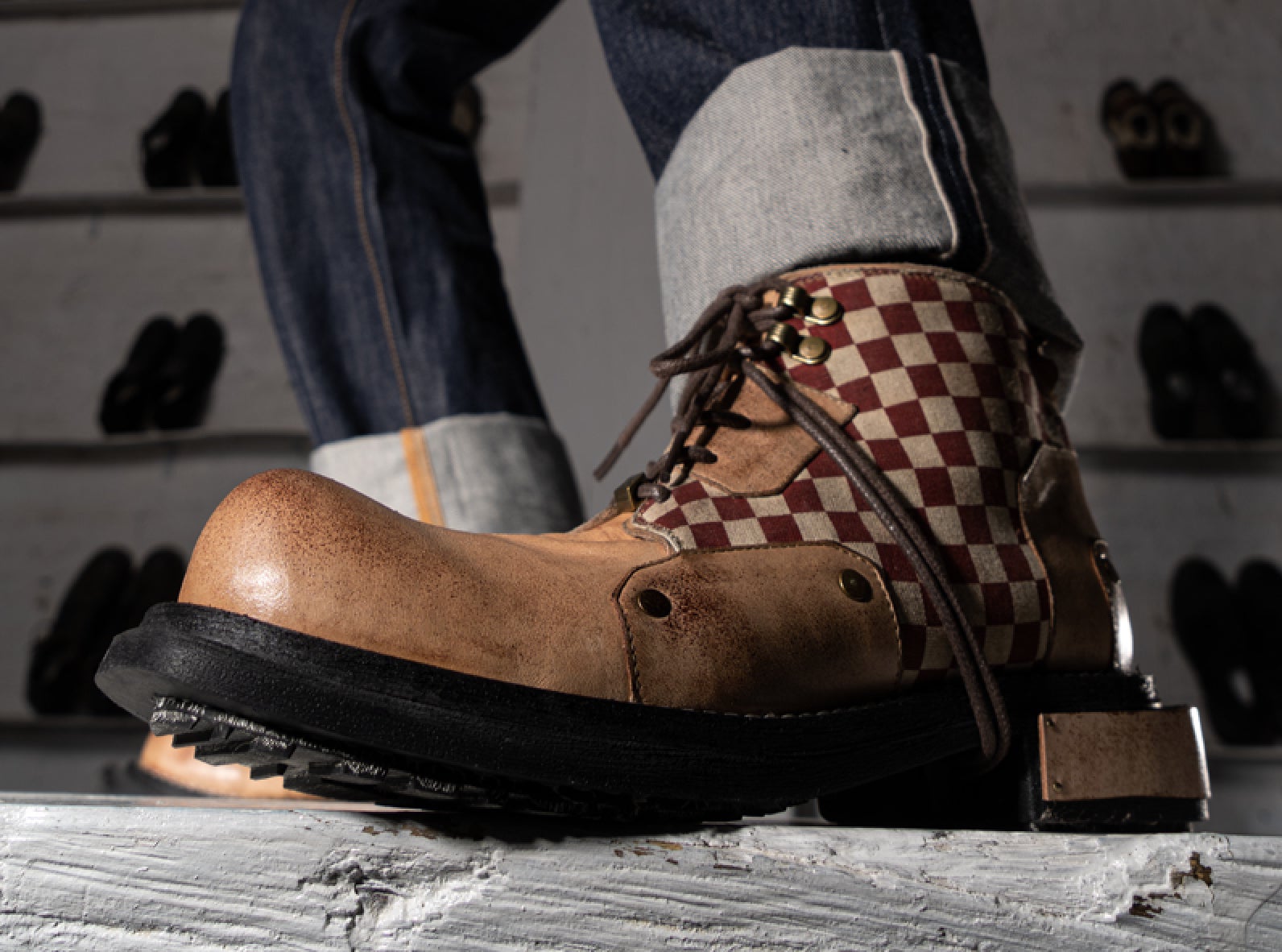 「編界Rewrite」のハンドメイドシューズはこだわりのヴィンテージ仕様。布の部分は色の擦り付けや、革の部分のシワに至るまで、ヴィンテージ感を再現できるように完全に手で仕上げています。敢えて荒っぽい感じを醸し出すところも、機械と手の融合で織り成す繊細な作業で、全体のラインを引き立てます。機械で計算されたフィット感の上に、ハンドメイドがもたらした上質感も、より体現できています。