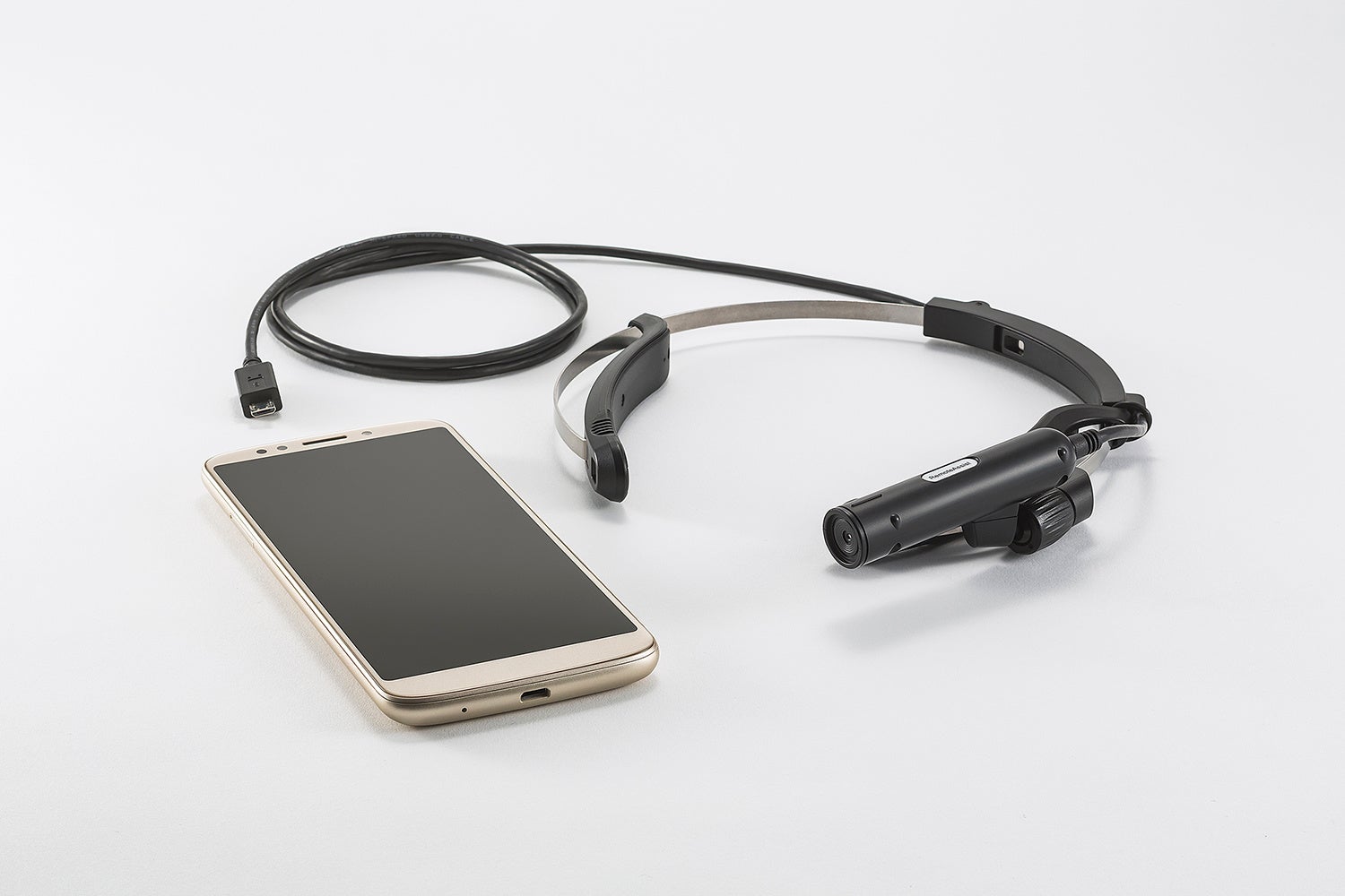 ヘッドマウント型ウェアラブルカメラと通信機(Android端末)は、USBケーブルで有線接続されており、サーバーを通じて作業者と指示者との双方向会話を可能にしています。