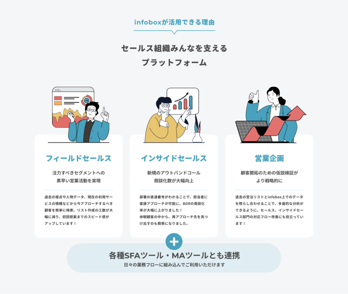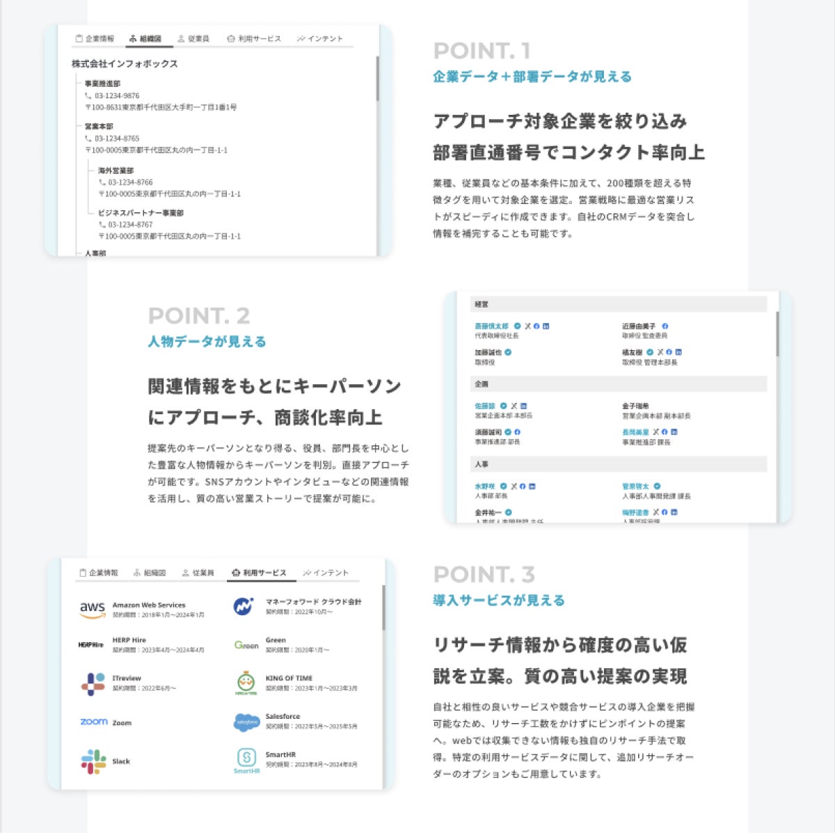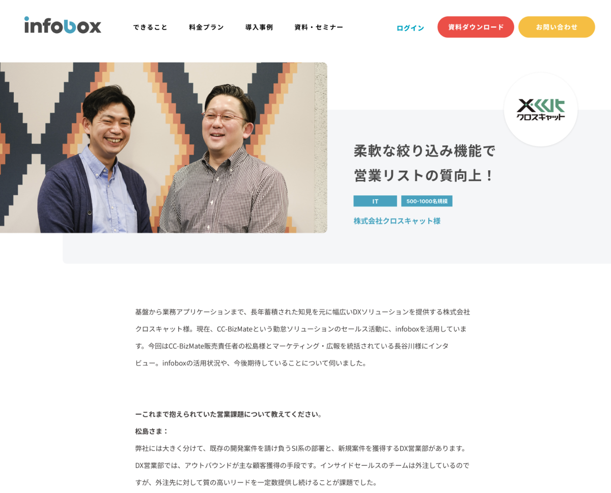 本ページでは、具体的なデータ項目を軸に、実際のシステム画面も交えながらinfoboxでできることを解説。ターゲット選定からアプローチに至るまで、infoboxを活用した「データドリブンな営業とは何か」を理解していただける内容を目指しました。