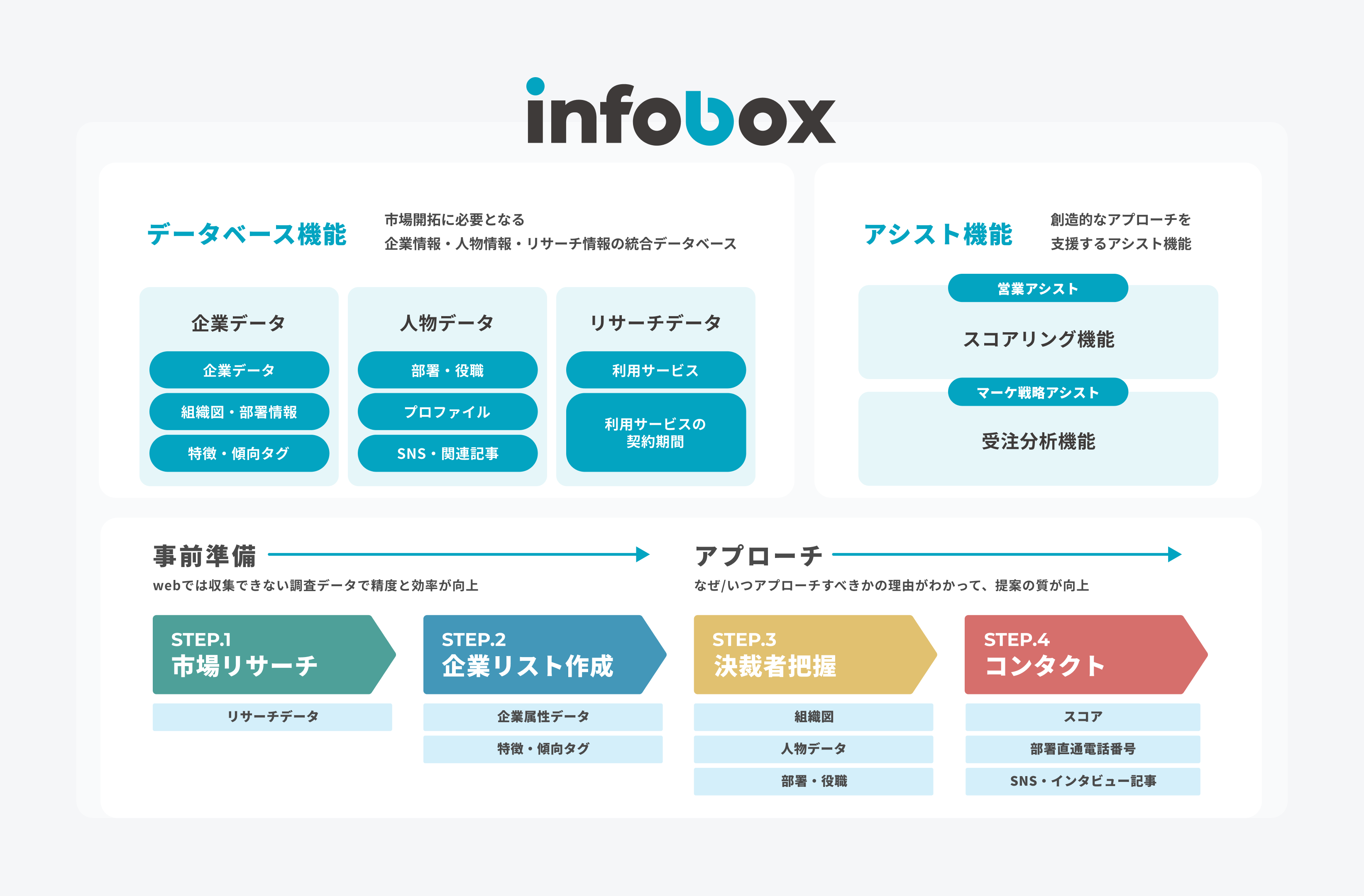 インフォボックスは市場リサーチ・企業リスト作成・決裁者アプローチを、一気通貫で実現する営業データプラットフォームです。スコアリングシステムで「why you now」を可視化し、営業体験に不可欠なセールスストーリーの構築を実現します。