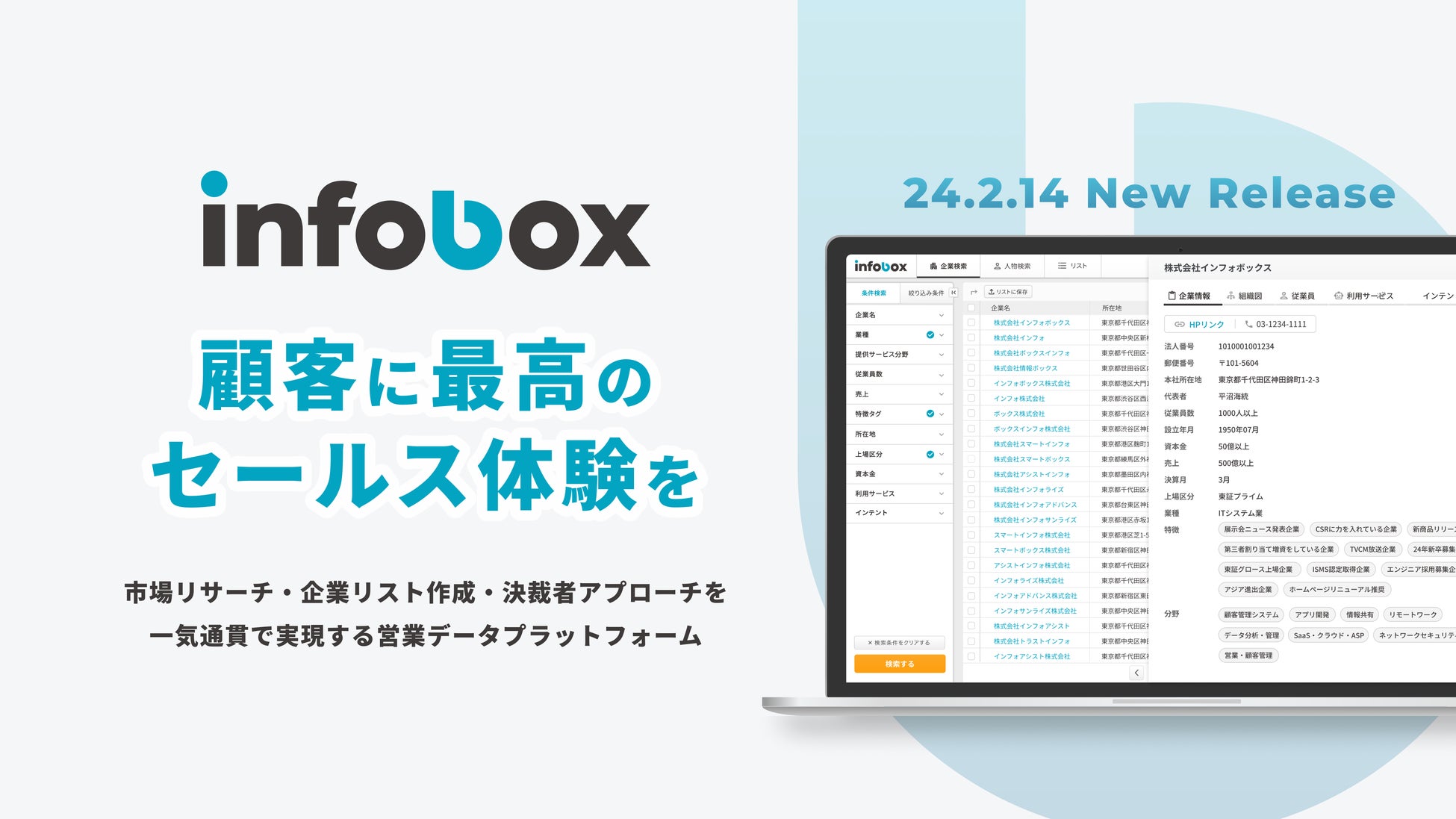 株式会社インフォボックスでは、BtoB市場における購買体験をアップデートし「ALL-WINNER」な世界を築くべく、革新的なプロダクトの開発に取り組んできました。営業データプラットフォーム「infobox」は、すでにトライアルバージョンでの提供を開始しており、十分な準備期間を経て2024年2月20日に本リリースとなります。