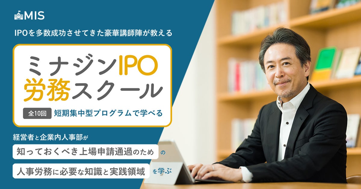 MISは、経営者、人事部門および社労士が上場審査通過のための労務監査の知識や実践的ノウハウを体系的に学ぶことができる講座プログラムです。2022年9月10日から2023年1月26日まで全10回のプログラムで構成されています。講座内容は就業規則・労使協定の整備から、労働時間管理、未払い賃金、安全衛生管理、採用・退職・懲戒を体系的に学べるプログラムとなっております。詳しくはMISホームページをご覧ください。