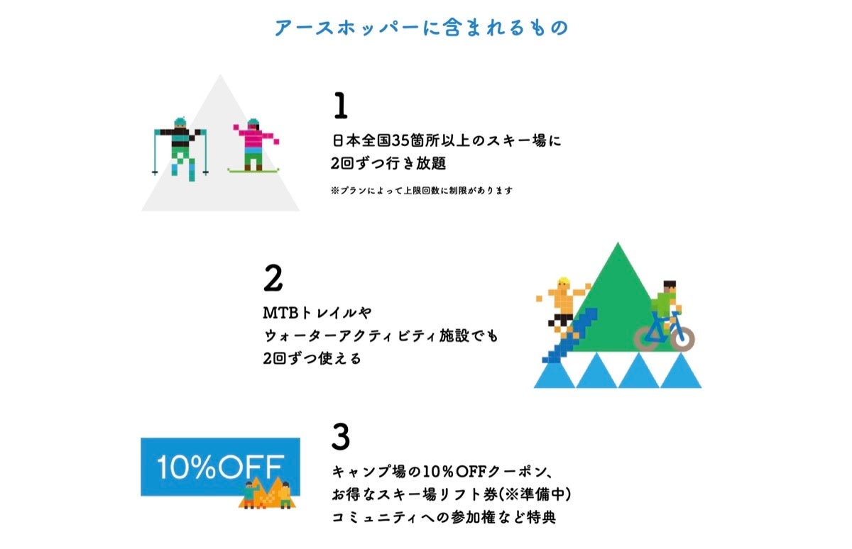 - キャンプ場の10%OFFクーポン、お得なスキー場リフト券(※準備中)、コミュニティへの参加権などの特典