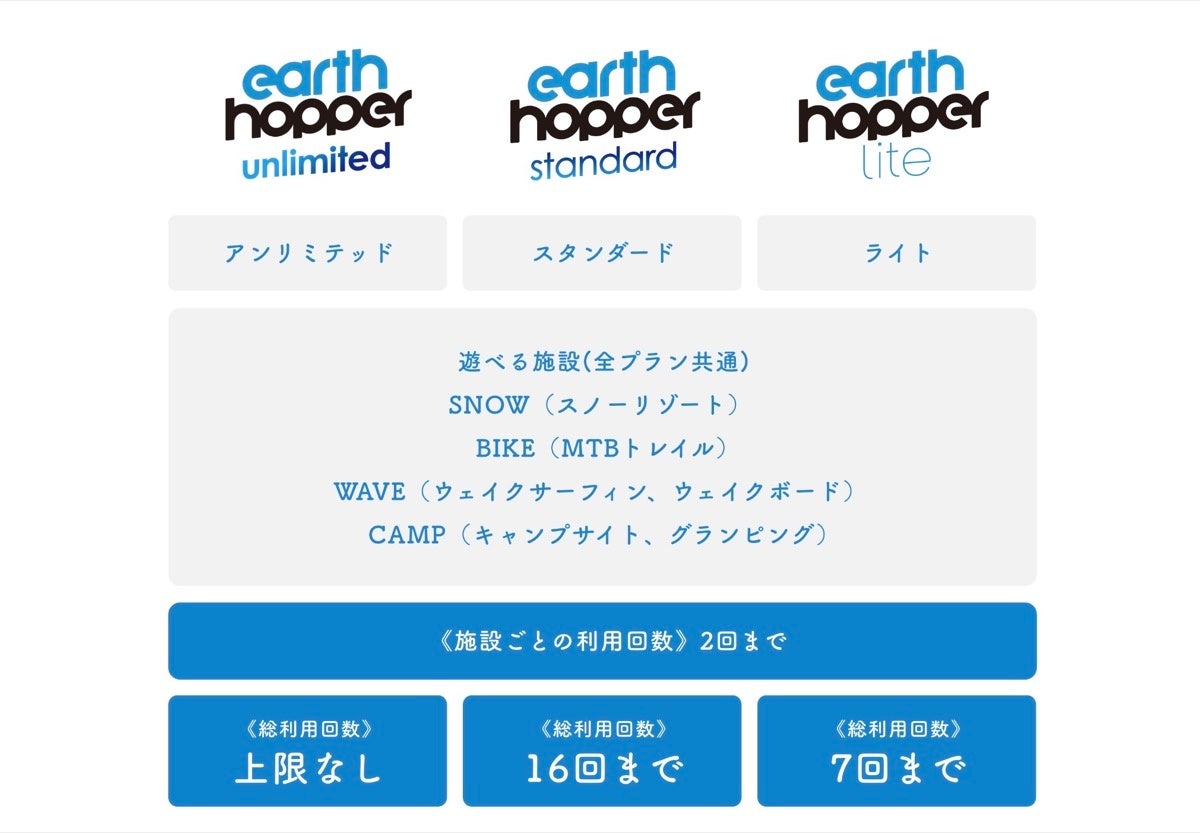 地球をホッピングするようにアーススポーツを楽しめる定額制オールシーズンパス「アースホッパー」を販売する株式会社Pioneerwork(本社:東京都台東区、代表取締役:後藤陽一)は、アースホッパーの発売から1周年となる本日2022年10月19日(水)、ライト層向け新商品「アースホッパー ライト」を発売します。これによりLite / Standard / Unlimitedの3つの商品が揃い、ライフスタイルに合わせて選べる3段階プランの提供を本格的にスタートします。