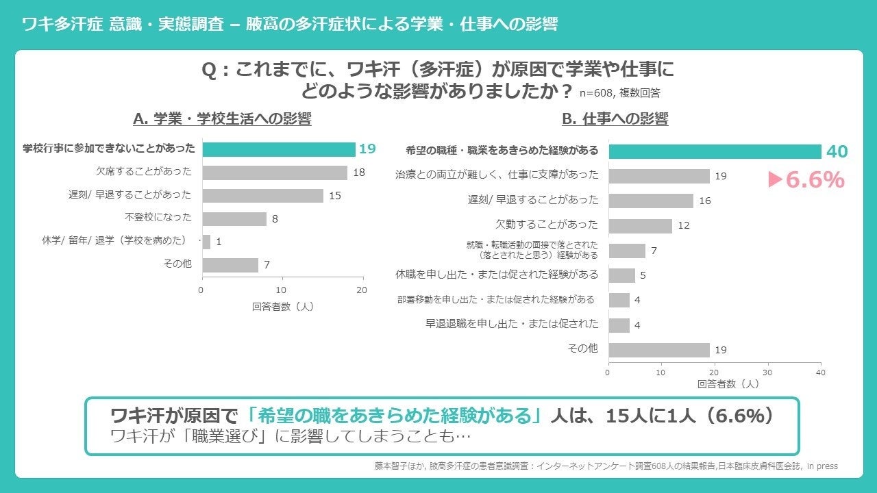 日常生活に困るほどワキ汗が多量に発汗する疾患「ワキの多汗症(腋窩多汗症)」は、潜在患者が国内に約720万人(※1)いるとされており、他の皮膚疾患(皮膚炎・湿疹、乾癬、アトピー性皮膚炎等)と同等もしくはそれ以上にQOLを低下させ(※2)、学業・仕事にも影響を及ぼすことから、1ヵ月あたりの経済的損失は、3,120億円(※3)に上ると推計されています。藤本先生によると、科研製薬と実施した「ワキの多汗症意識・実態調査」(※4)では「ワキ汗が気になり始めた時期で一番多かったのが『中学生(21.9%)』、次いで『高校生(18.4%)』、『20~29歳(17.3%)』と思春期を迎え周囲のことが気になり始める中高生や新たなライフステージを迎える新社会人など、若い方に多い」ことが判明。