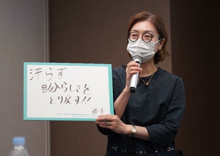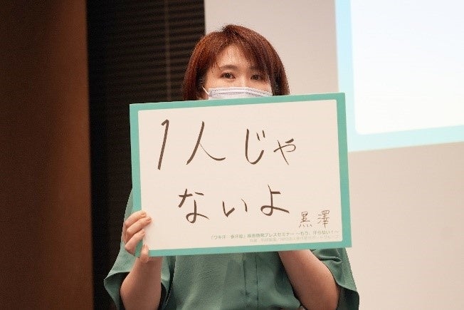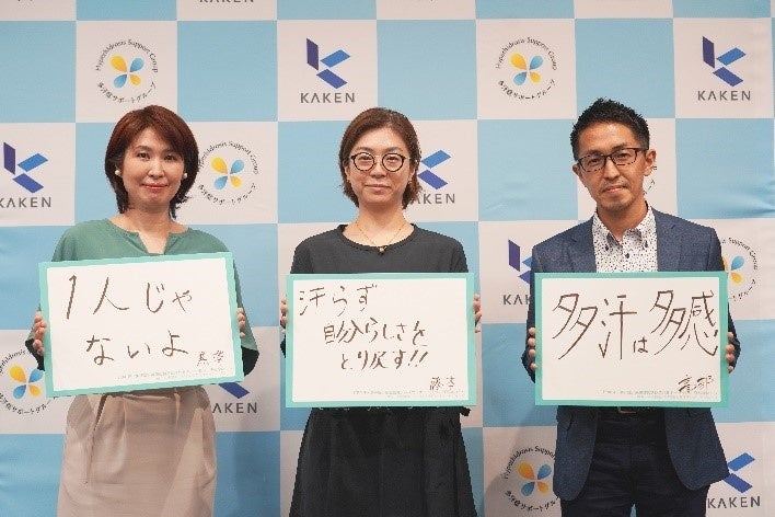 座談会の最後は、ワキ汗や多汗症に悩む方々に向けてのメッセージをいただきました。高部さんは「多汗は多感」、黒澤さんは「1人じゃないよ」、藤本先生は「汗らず、自分らしさをとり戻す‼」とフリップで発表。