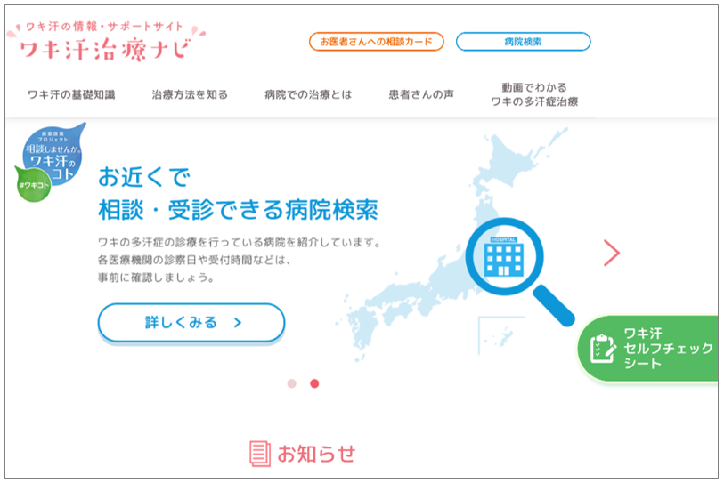 具体的には腋窩多汗症(ワキ汗)について広く知られ、悩む方が相談しやすく適切な治療を受けられる環境を目指します。ワキ汗の情報・サポートサイト「ワキ汗治療ナビ」による病院検索及び科研製薬公式YouTubeチャンネルの開設、そして今回の患者意識調査もそのプロジェクトの一環です。
