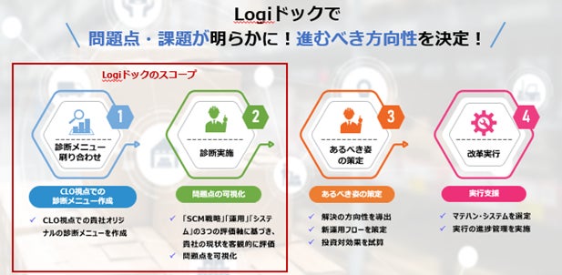そこで、自動倉庫を始め、効率的な物流システムの構築において数多くの実績を持つAPTが、物流業務改革の構想策定に強みを持つSSAと、『Logiドック』と称した、CLO視点の専門的な物流診断を行うサービスをスタート致しました。この『Logiドック』は、数多くの現場で効率的な物流システムを構築してきたAPTが監修し、構想策定に強いSSAが執り行うからこそ、極めて確度の高い中長期計画の作成とそれに基づく取り組みを実施出来るものと自負しています。