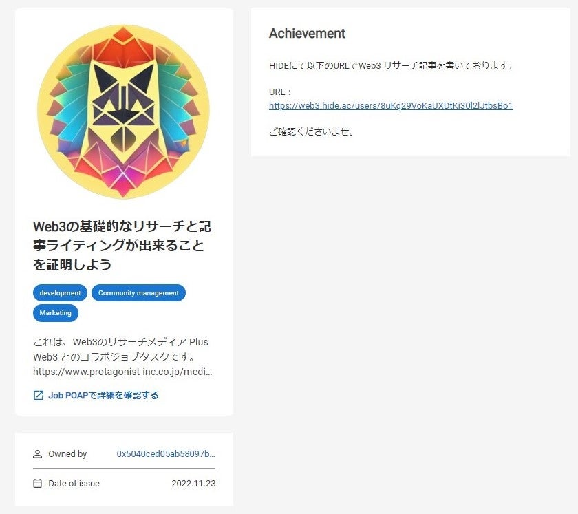 ※「Job POAP: Job Proof of Achievement Protocol」は、海外の「POAP: Proof of Attendance Protocol」を参考にさせて頂いております。
