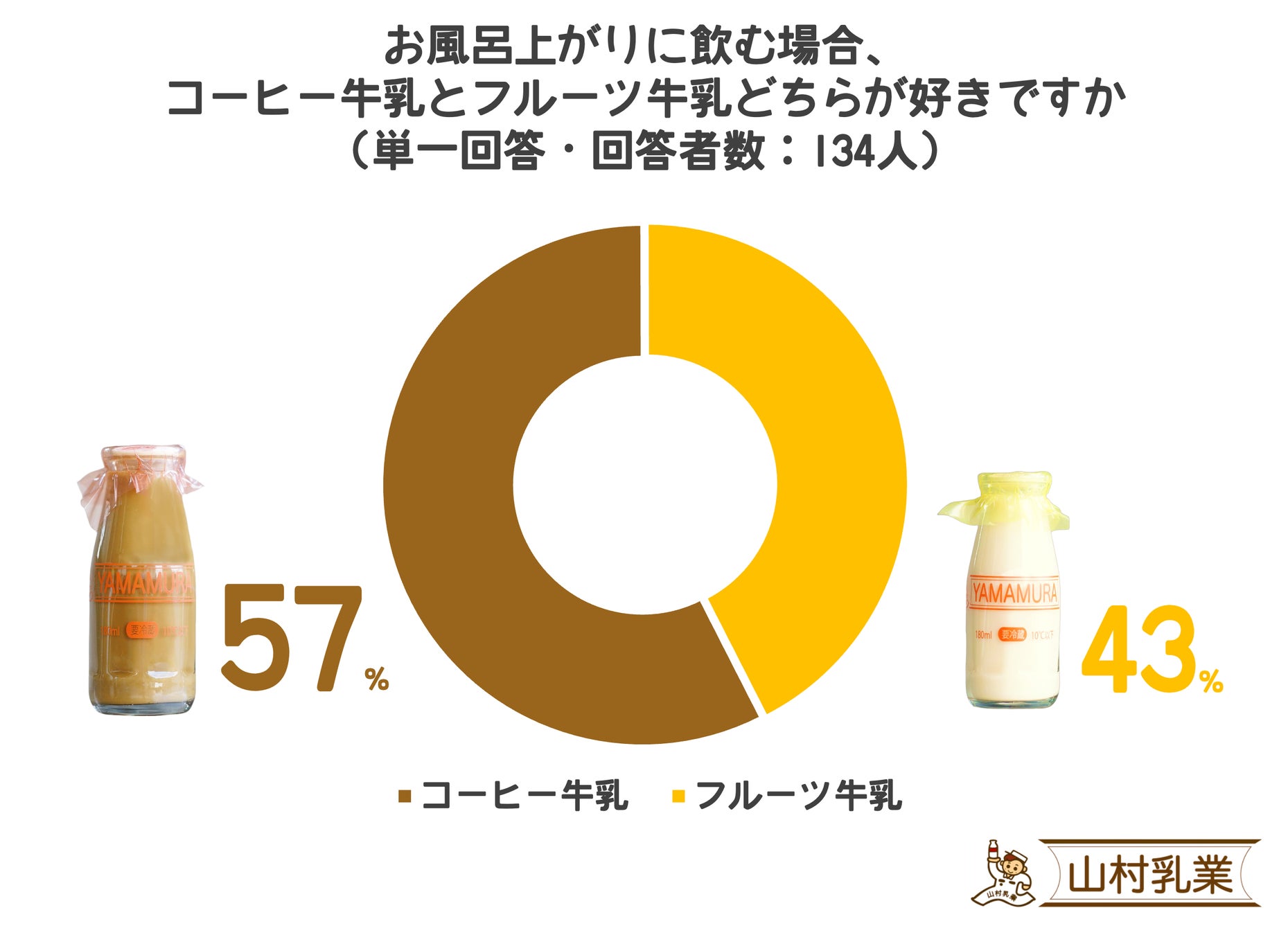 2)お風呂上がりでは、コーヒー牛乳派57%、フルーツ牛乳派43%