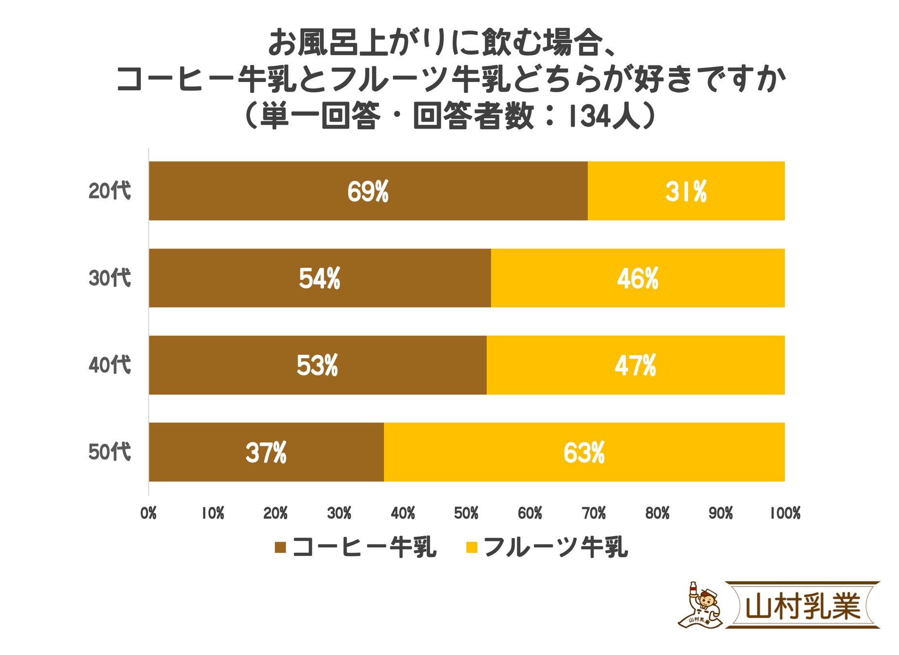 瓶入り乳製品の品数日本最多※、有限会社山村乳業(本社:三重県伊勢市大世古3丁目5-8、代表取締役:山村豊裕、以下弊社)は、乳飲料として長年親しまれてきたコーヒー牛乳とフルーツ牛乳について、どちらがより人気が高いのかを探るため、全国20代~50代の男女合計134人を対象に調査を行いました。銭湯や温泉での湯上がりの一杯としても人気の2種類の飲み物について、日本浴用剤工業会が制定した11月26日いい風呂の日を前に、その調査結果を発表いたします。