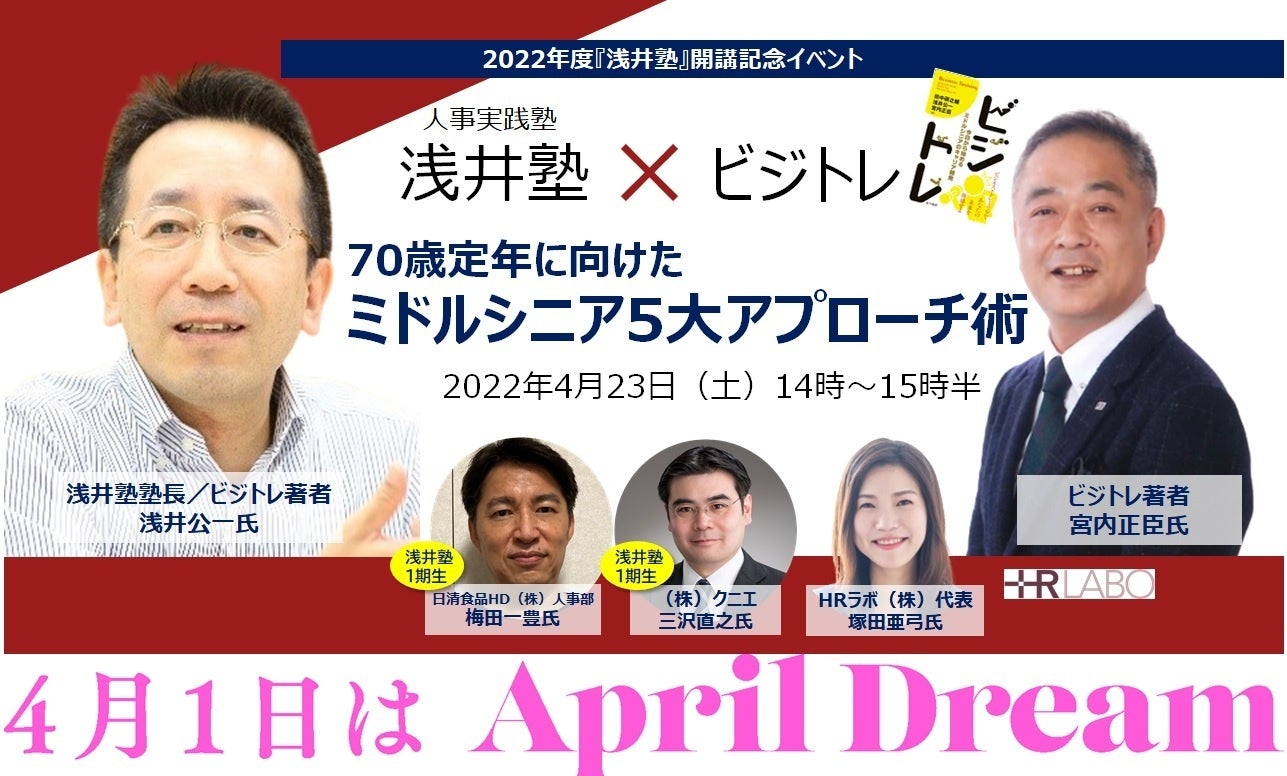 2022年4月、企業におけるミドルシニア対応の充実を目指し、人事実践塾「浅井塾」の塾長であり、「ビジトレ」の著者であり、NTTコミュニケーションズ株式会社でキャリアコンサルティング・ディレクターを務めている「浅井公一氏」と、企業人事担当者やキャリア支援者向けにイベントを実施します。