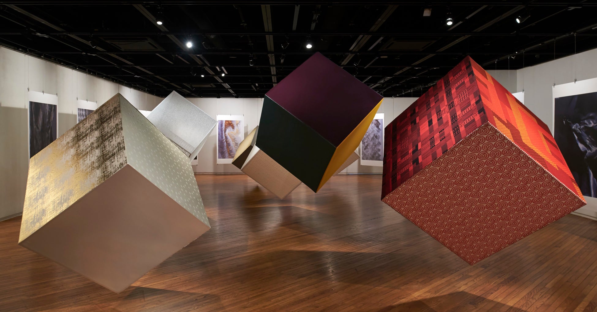 今回の展示デザインを手掛けるのは「新たな視点と、価値を、かたちにする」をコンセプトに、独自のアプローチでデザイン活動を行うwe+の林登志也と安藤北斗。世界のデザインシーンで注目を集める彼らとのコラボレーションが、NUNOのテキスタイルにあらたな表情を与えます。宙を漂うキューブ状のオブジェの間を回遊する体感型の展示をお楽しみください。