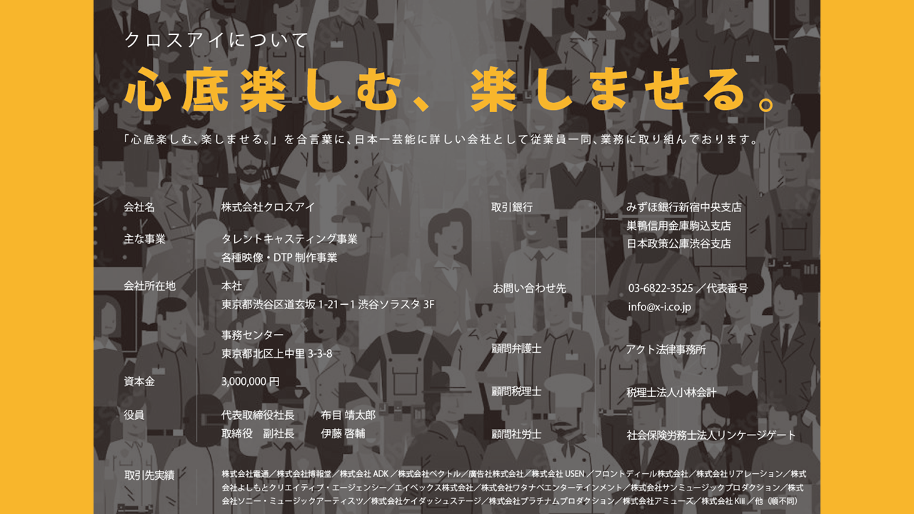 株式会社クロスアイは芸能事務所、インフルエンサー事務所出身のディレクターで構成された「日本一芸能に詳しい」キャスティング会社です。