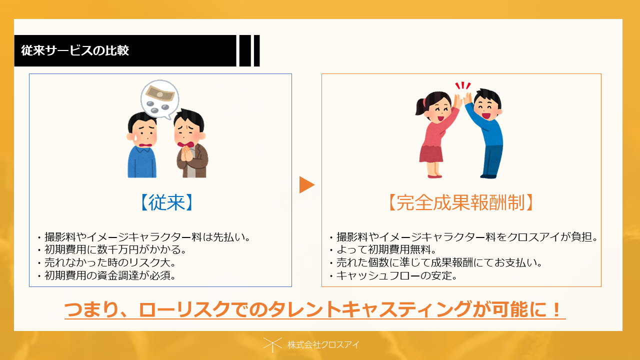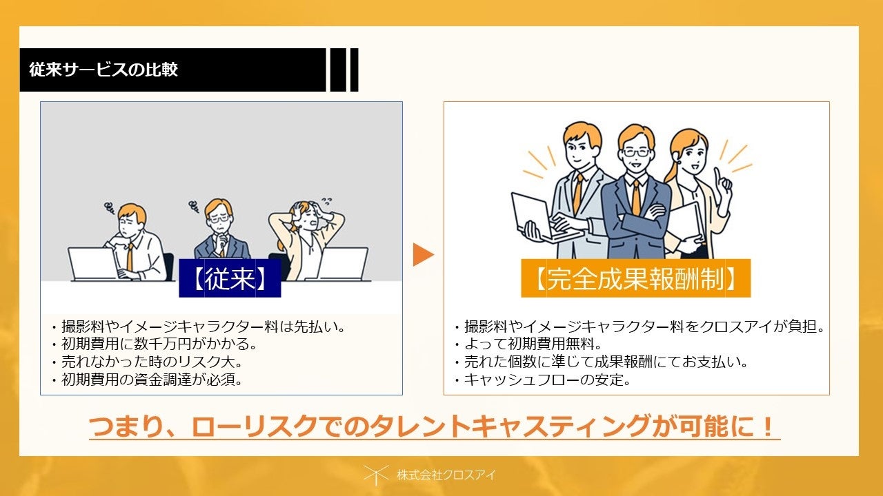 ・撮影料やイメージキャラクター料をクロスアイが負担いたします。