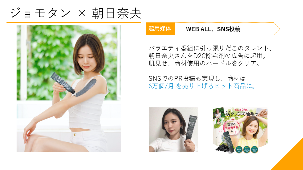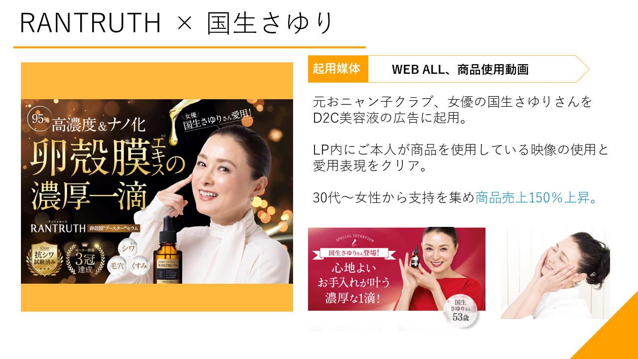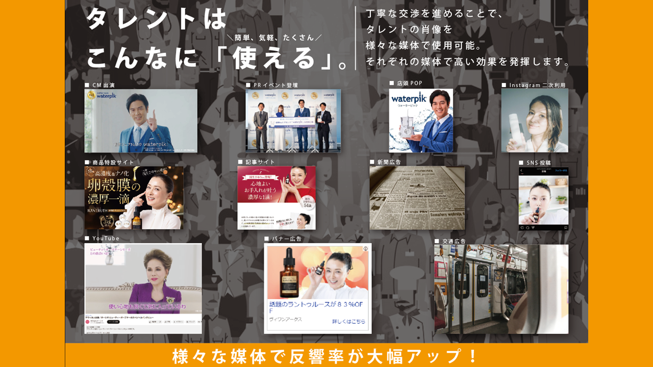 D2Cメーカーを初め、さまざまな企業様の広告へ有名人やインフルエンサー、専門家などの著名人を最適な条件にてご提案いたします。