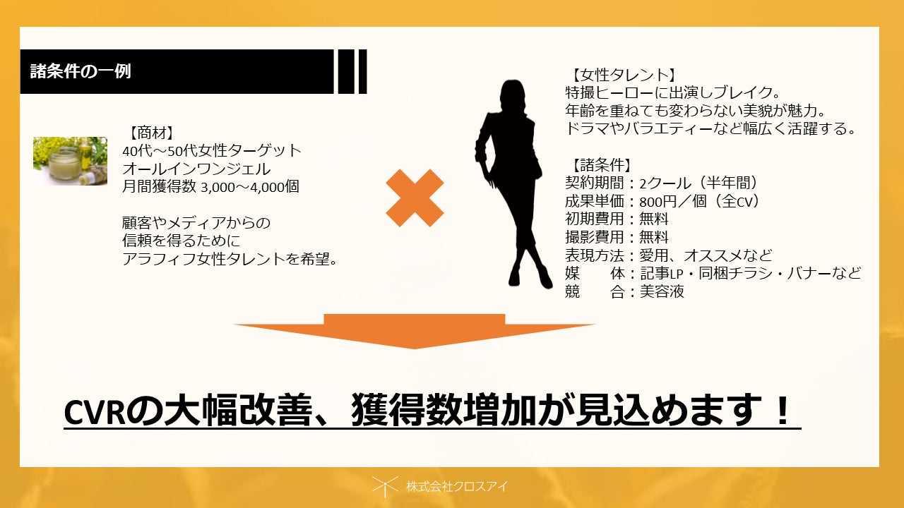 株式会社クロスアイ(本社:東京都渋谷区、代表取締役社長:布目靖太郎、以下、クロスアイ)は、 キャスティング初期費用ゼロ円・完全成果報酬制でタレント起用ができる「アフィキャス」のサービスを開始いたしました。