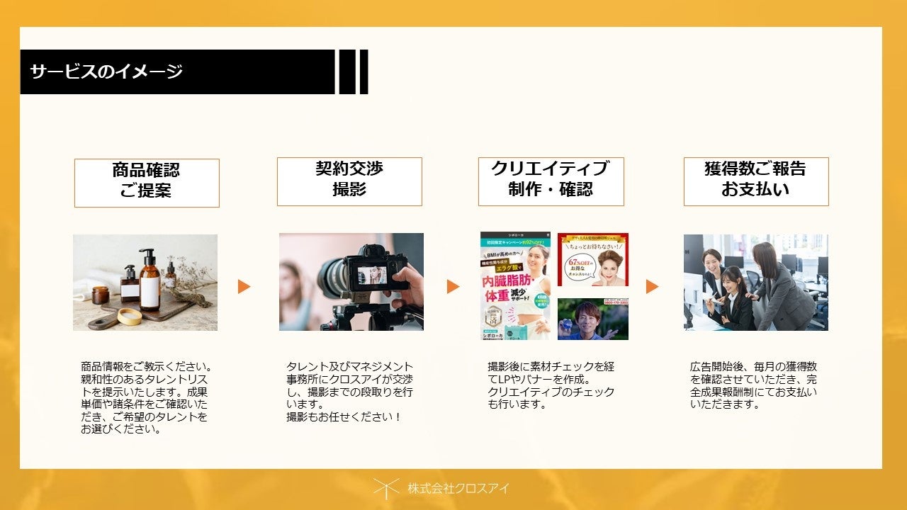 タレントを広告に起用する際にかかる「初期費用」をキャスティング会社が全額負担。完全成果報酬制度で、売上に応じたタレントギャランティをお支払いいただくシステムです。