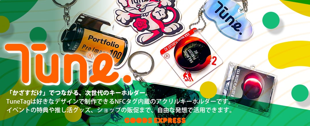 アーティスト物販、クリエイターグッズ、企業ノベルティ、来店誘導まで幅広い施策にフィットします。詳細・問い合わせは公式サイト(https://tunetag.jp/)へ。