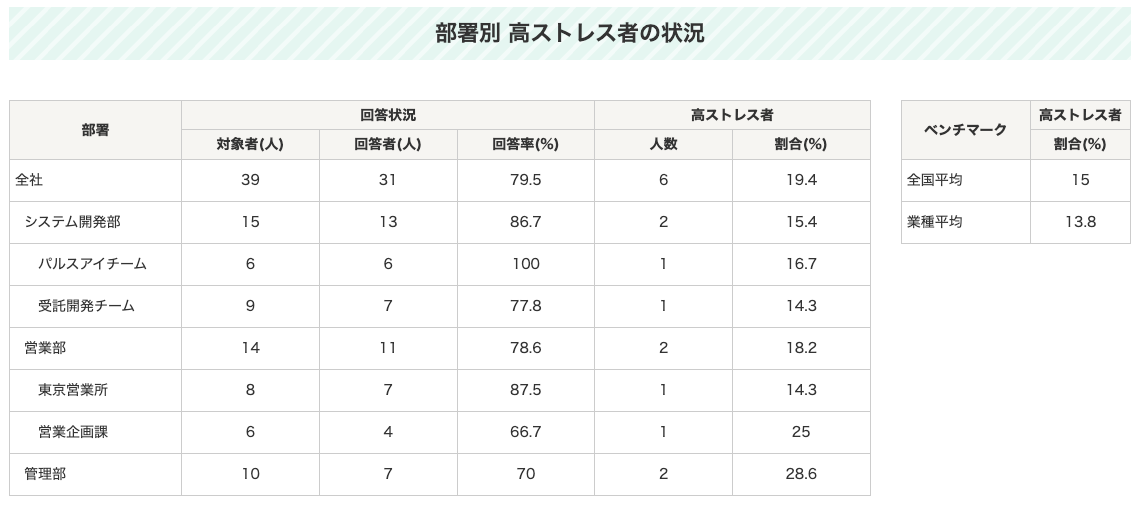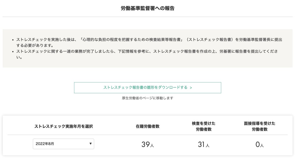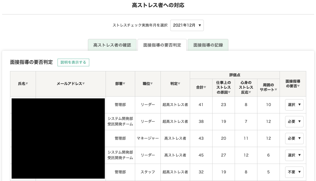 ストレスチェックの実施者(産業医)が、高ストレス者に対する面接指導の要否判定や、面接指導の記録を残すことが可能で、社内の高ストレス者への適切なフォローを行って頂けます。また、労働基準監督署へ提出するストレスチェック報告書に記載が必要な情報も、集計の上、提示します。
