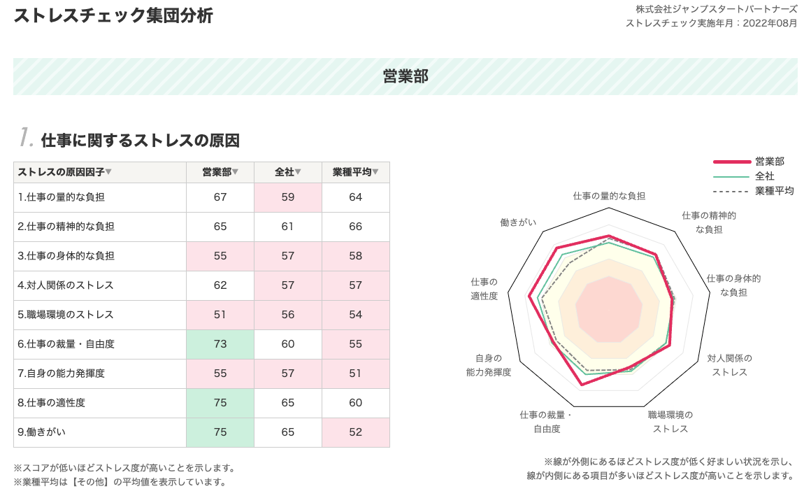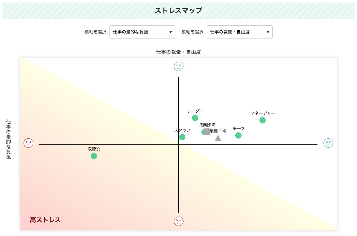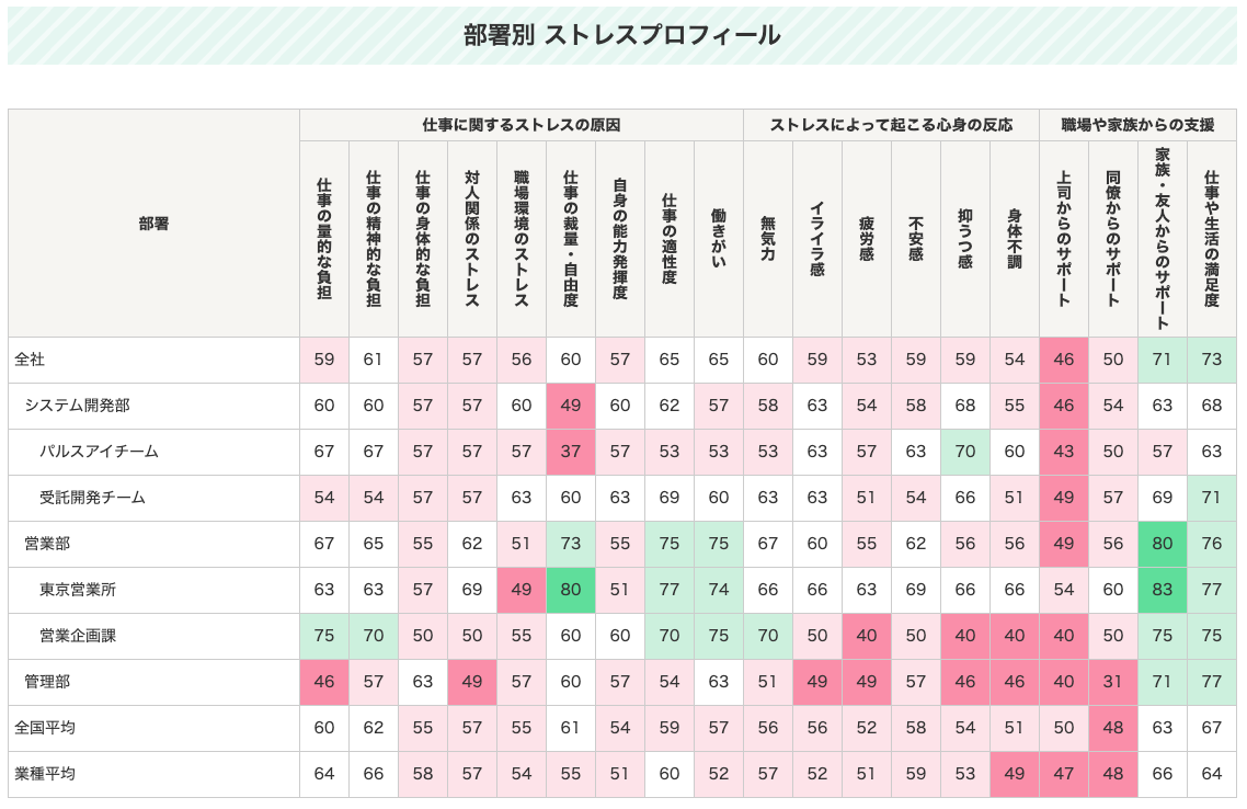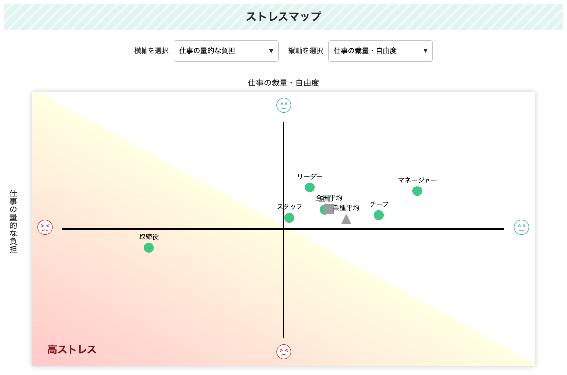 ストレスチェックの結果を集計・分析する上で、集団分析/部署別比較/職位別比較の3つの機能が用意されています。部署ごとの結果を確認するだけでなく、任意の2項目を選んでストレス状況を一覧化できるストレスマップ、部署別のストレスプロフィール、高ストレス者の状況把握などを行い、メンタルヘルスを意識した職場環境の改善につなげられます。