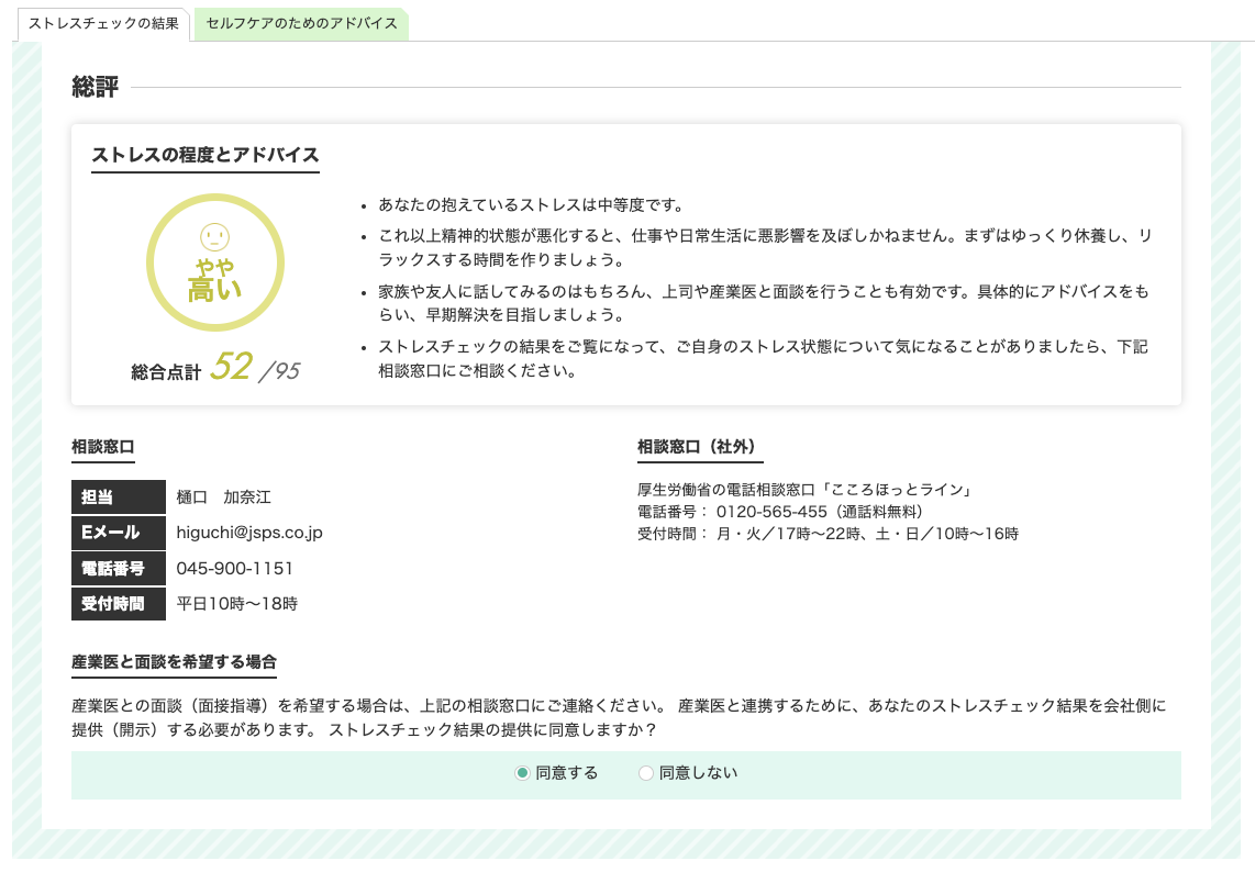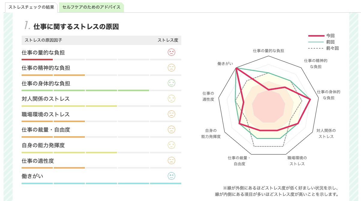 従業員向けのフィードバックシートでは、自分自身のストレス状況について項目別に把握でき、前回(昨年)、前々回(一昨年)の結果との比較も可能です。また、結果に応じて、項目別のストレス状況を解説し、ストレス改善につながるきめ細かなアドバイス(※国内大手自動車メーカーの産業医監修)を提示します。