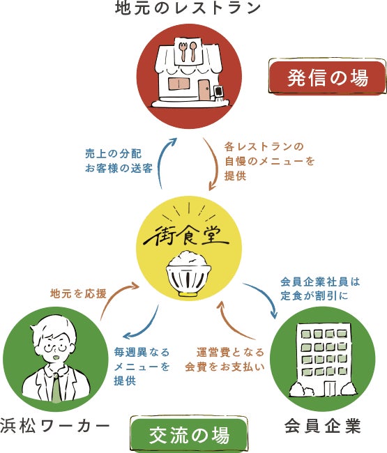 他方で海・山・川・湖と自然にも恵まれ、また浜松を本拠地とする優良企業も多く、「やらまいか精神」を合言葉に若手企業家や新しいチャレンジを応援する風土もあるのが浜松です。街食堂は会員企業の多様な世代の働き手を中心に、起業家や個人で活動する人々が交流を深める場となり、浜松で働く価値を上げること、また次世代が育つ場になることを目指し運営してまいります。