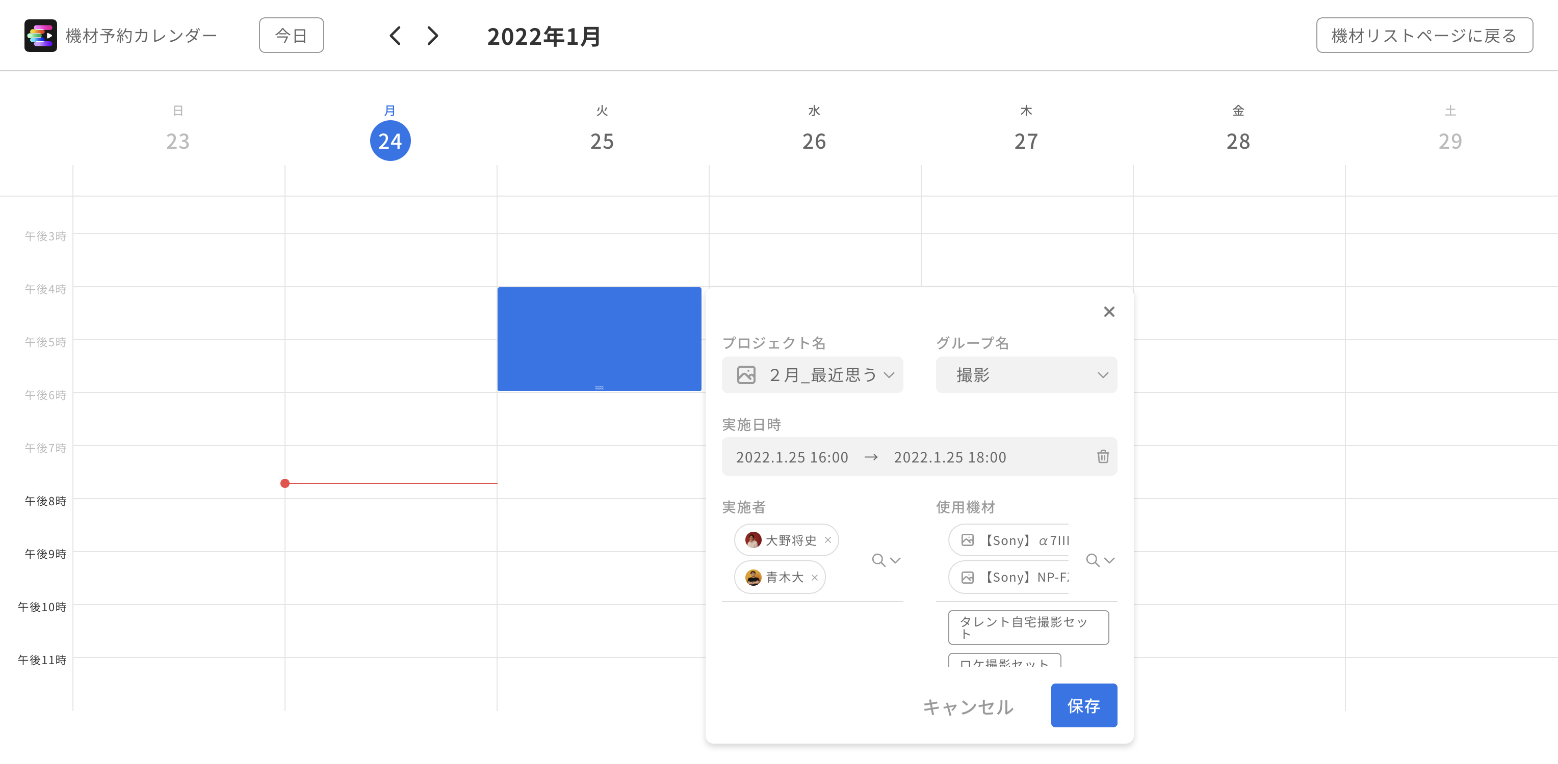 チームで所有している機材をカレンダー上で簡単に予約することができる機能です。
