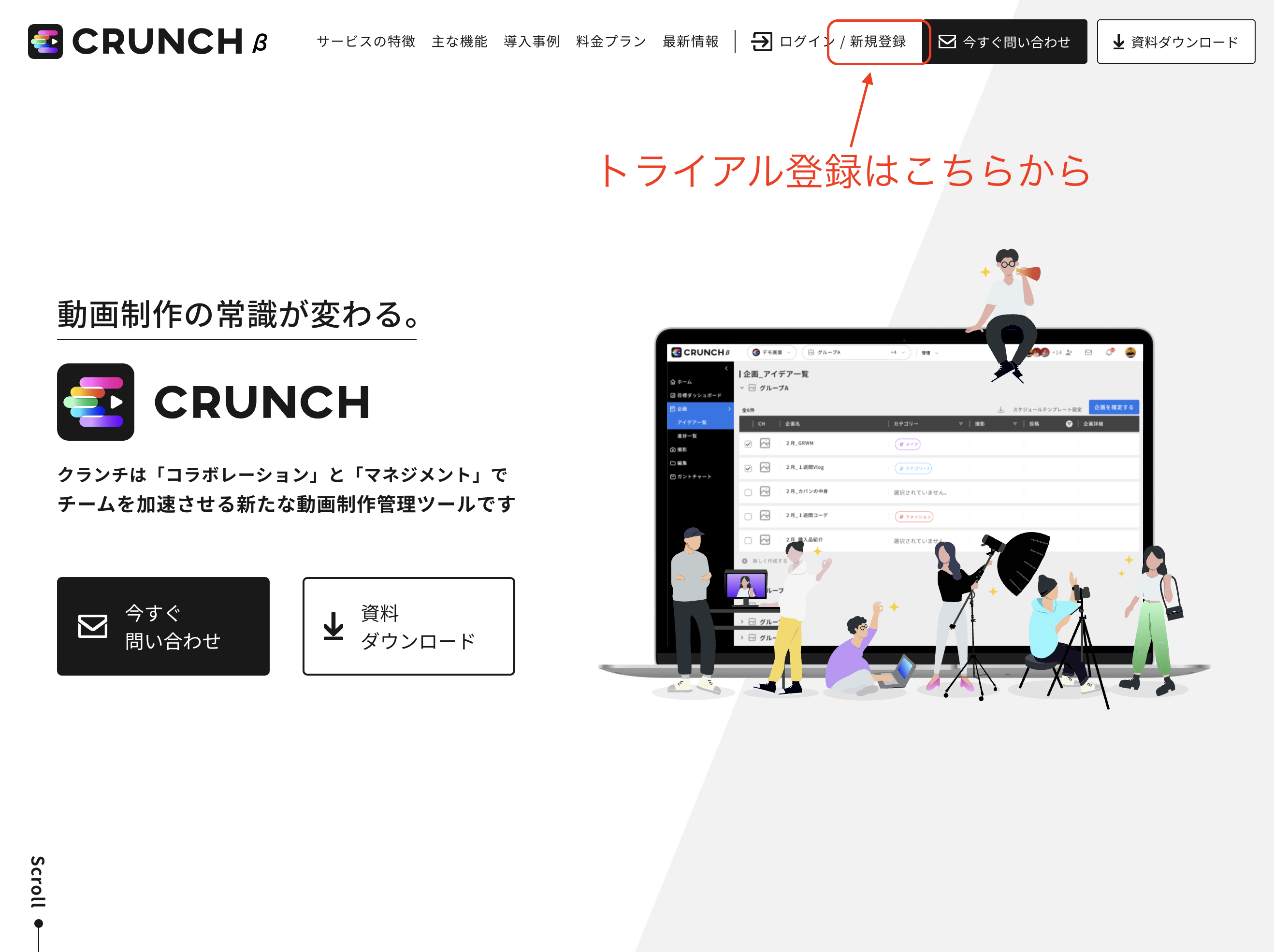 「CRUNCH(β版)」はYouTube動画制作を支える「強い動画チーム」の立ち上げ・運用・成長をサポートするAll in Oneな制作管理ツールです。
