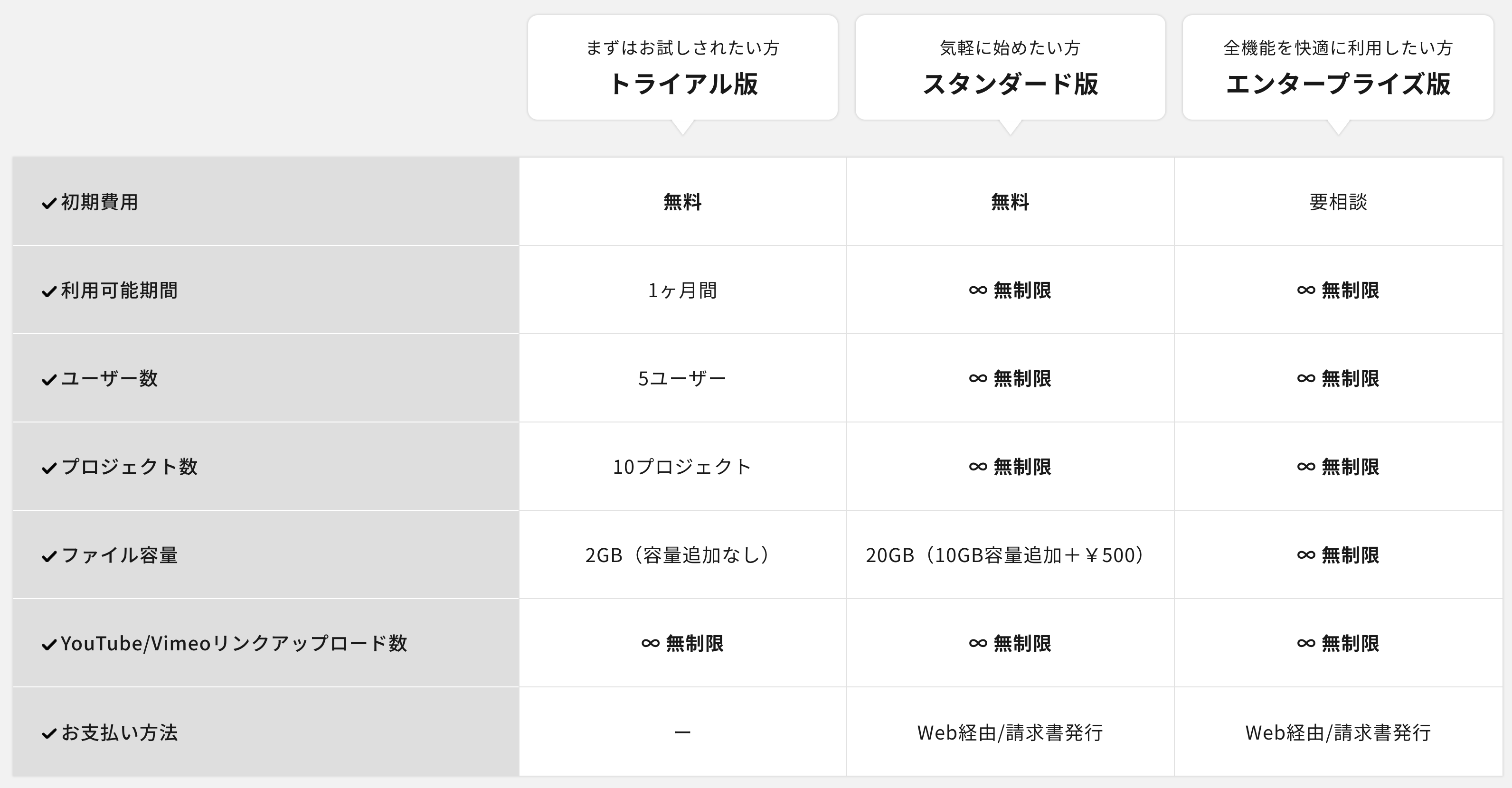 動画制作の各工程(企画、撮影、編集、公開)における「課題」を解決し、役割・職種を超えてスムーズにコラボレーションすることができるサービスです。
