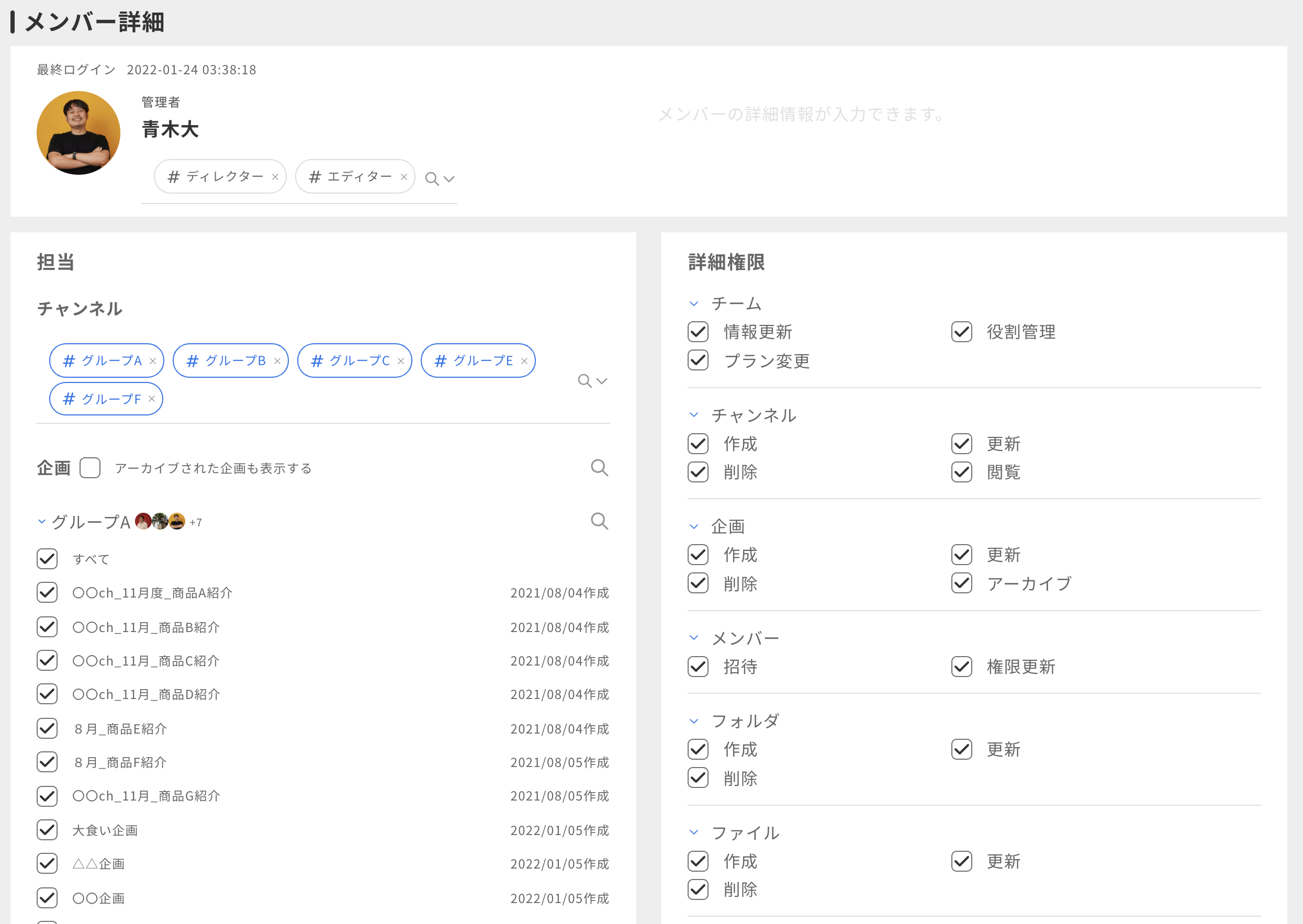 登録されている各種データには、柔軟にアクセス権限を設定することができ、パートナーを含むあらゆる役割の方に安心してご利用いただくことができます。