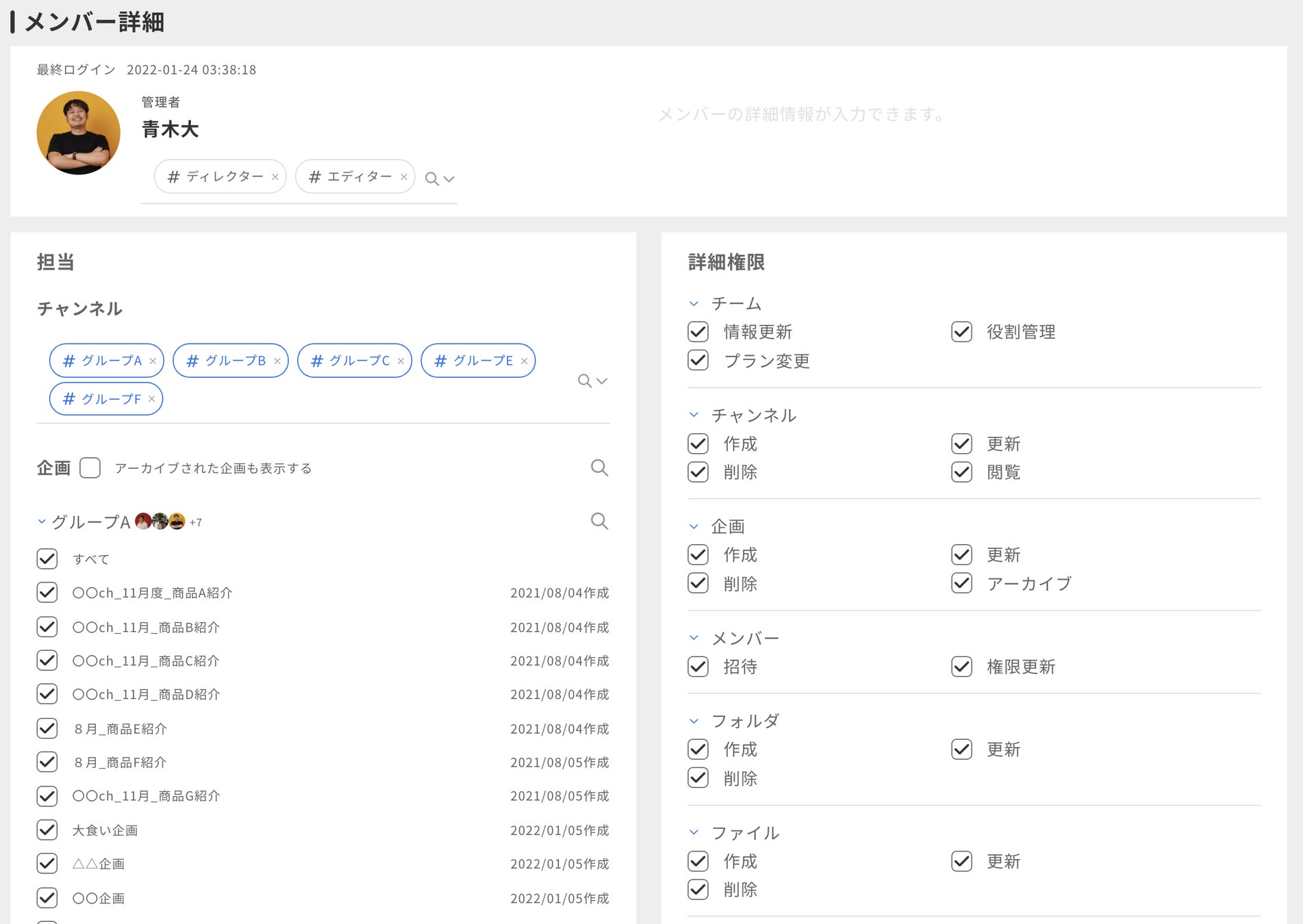 また、「〇〇削除の操作を指定ユーザーのみに許可したい」といった各種操作に対する権限に関しても、柔軟に設定することが可能です。