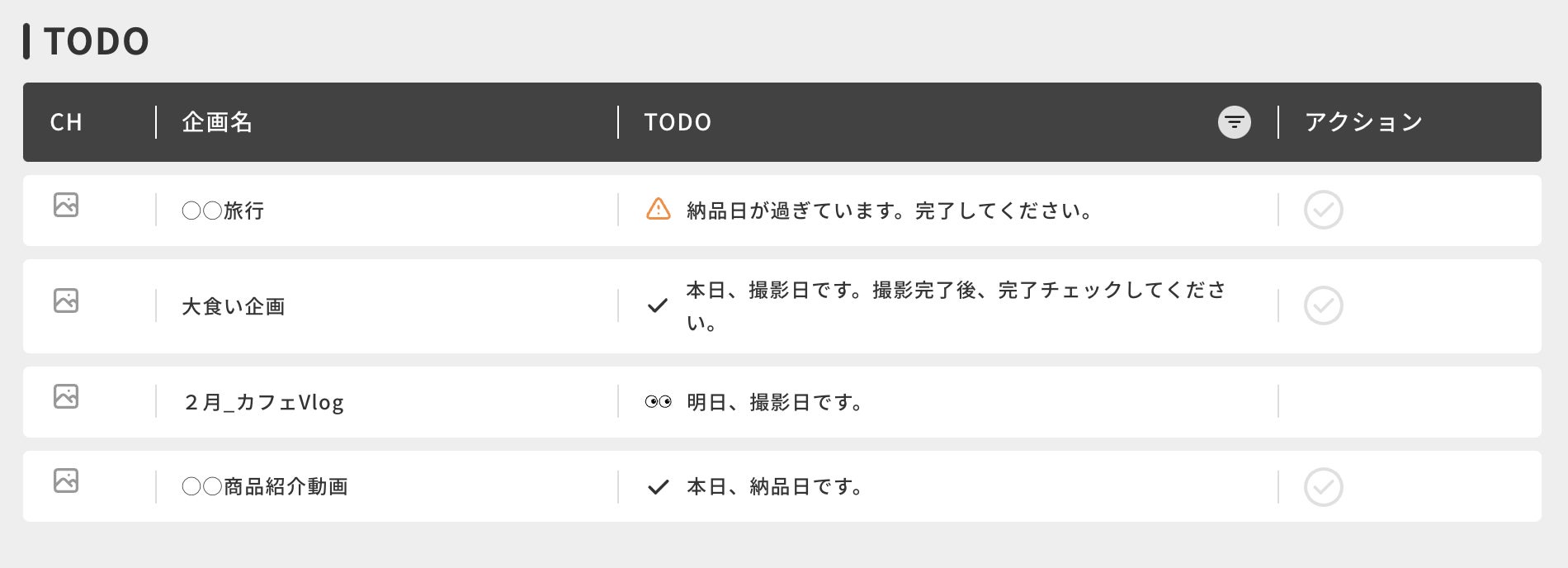 複雑に入り組んだ動画制作の進行管理をサポートする機能です。