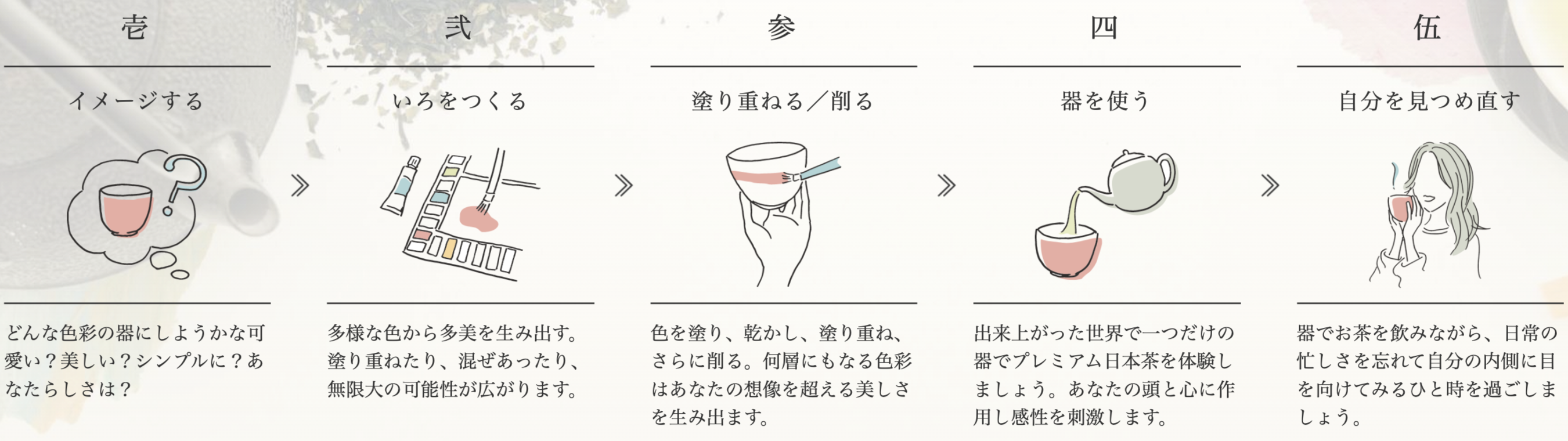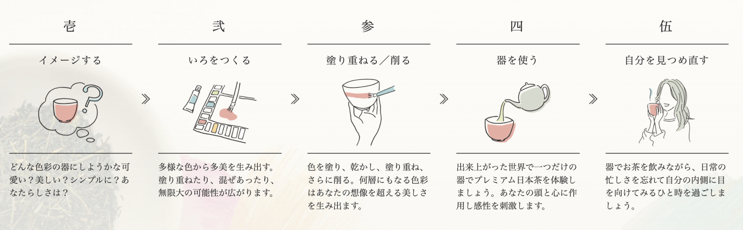 世界でひとつだけの器をお作りいただけます。また、一般的な工芸体験では作品が手元に届くまで数週間~2ヶ月かかるところ、当日その場ですぐに完成した器でお茶を飲む「カフェタイム」まで体験することができます。