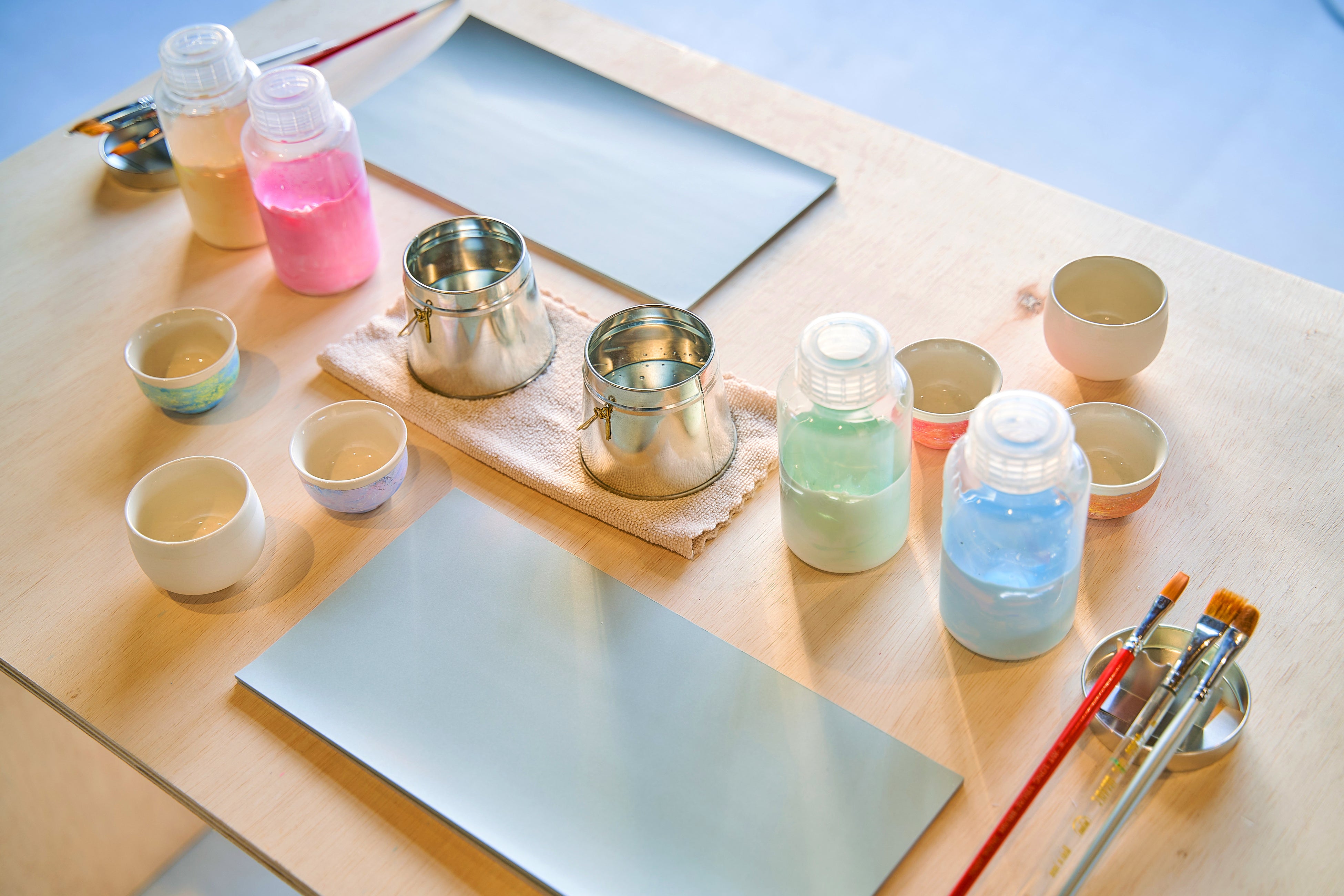 ご持参いただいた写真をもとに、色鮮やかな17種類以上の塗料から、作りたい世界観を想像し3色選定します。通常プランでは湯飲みやお猪口に色を付けますが、親子プランのみ限定で「九谷焼」のマグカップに色を施します。写真からイメージする色や、理想の色を作る過程はそれぞれ。大人もこどもも自分の感性を信じて色選びすることを心掛けてみてください。