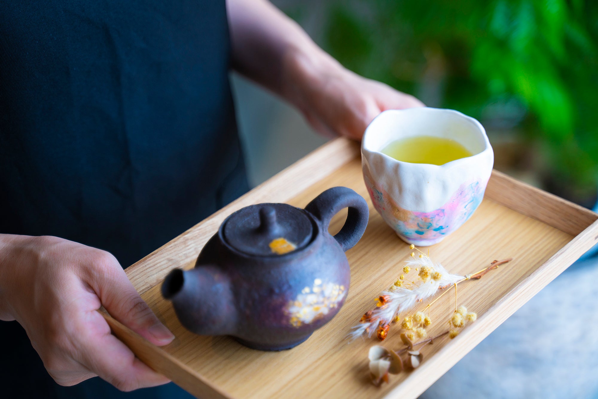 伝統文化を次世代へ伝えていくために、時代に合わせた楽しみ方を提供したいと考え、この度「金沢茶寮」を開業する運びといたしました。また、吉岡氏と松浦氏、それぞれの視点が重なり合い生まれた最先端の「金沢塗」の色彩は、江戸時代から続く「金沢塗」特有の漆による色彩ではなく、陶器に色鮮やかな10種類以上の塗料を重ね塗り、削り、感性を研ぎ澄ましながら器を描く技法となります。