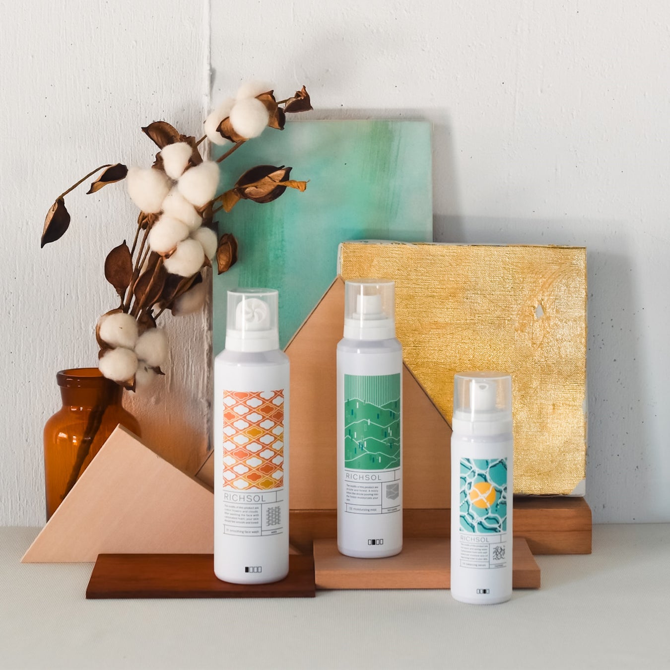 日本画をパッケージデザインに採用。自然美との調和を目指したスキンケアシリーズ【RICHSOL】から3アイテムを販売開始。