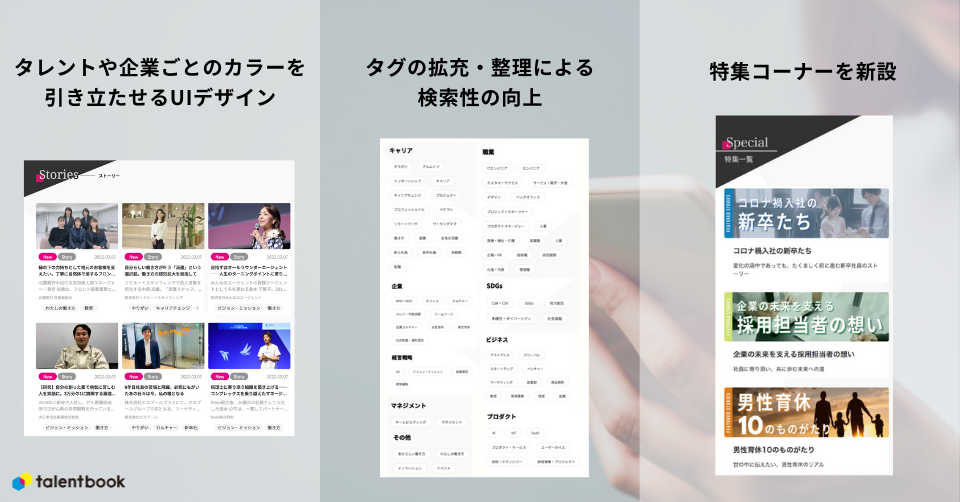 今回のリニューアルにより、talentbookに公開されているストーリーの検索性、視認性が向上し、自分に合った「働く人」のストーリーに出会えるメディアへと進化してまいります。併せて「男性育休」や「コロナ禍入社の新卒」など、社会テーマと連動した特集コンテンツを順次展開いたします。