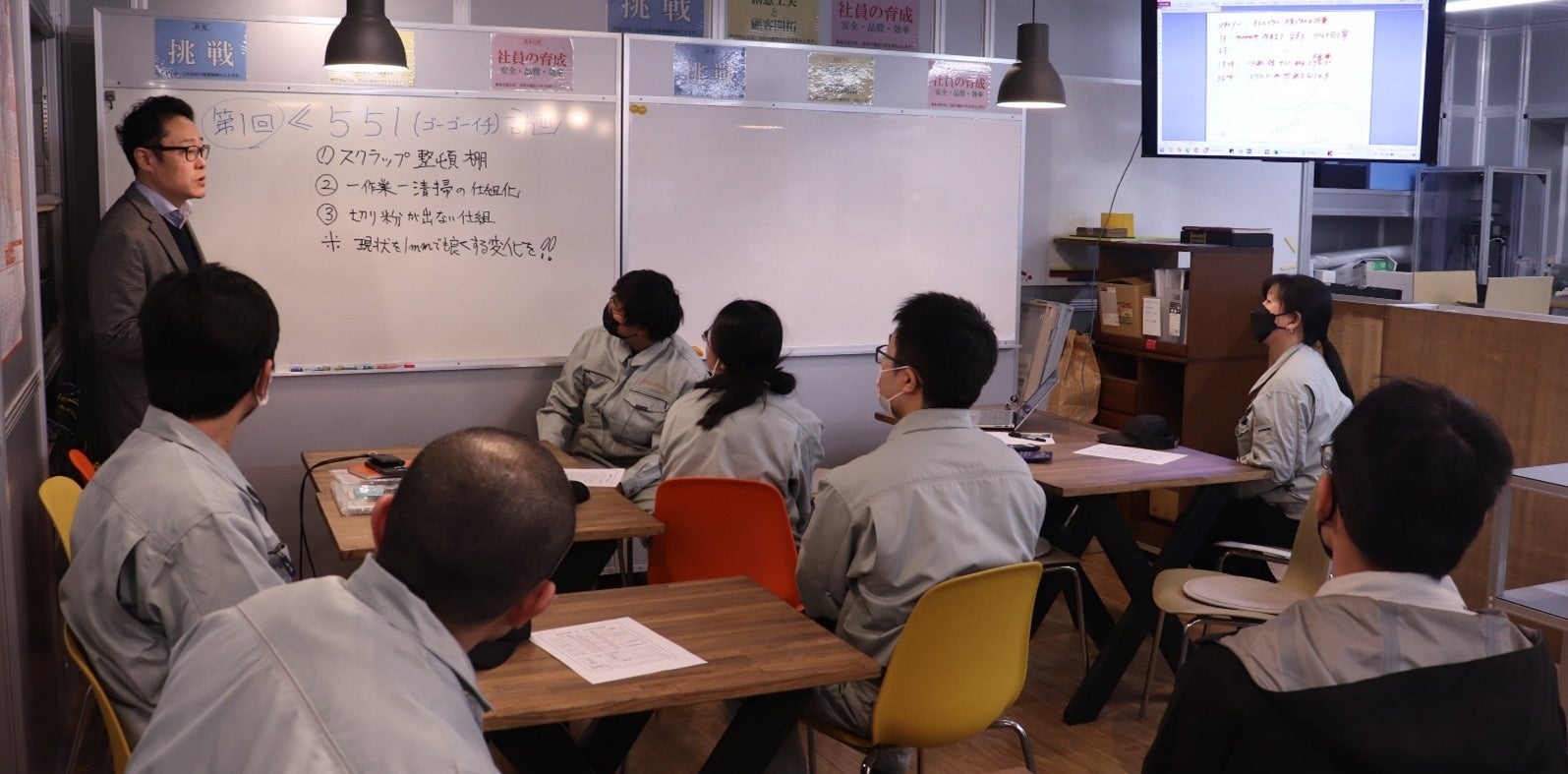 当社はこれまでも毎月、製造部門による「製造会議」を行ってきました。新たにスタートした「5・50・100(ゴーゴーイチ)会議」では、製造部門だけでなく社⾧含めた他部門の社員も参加します。