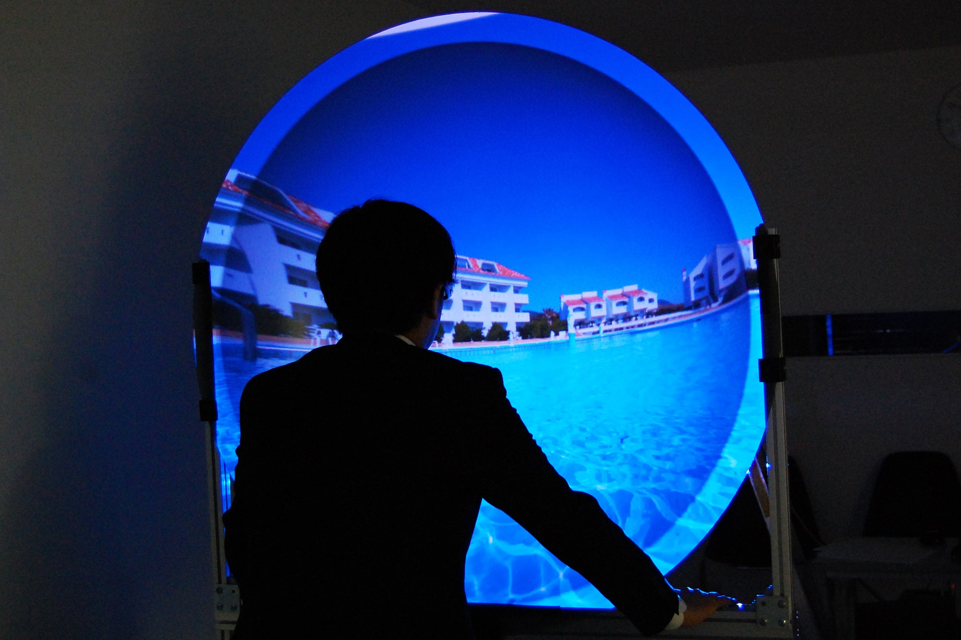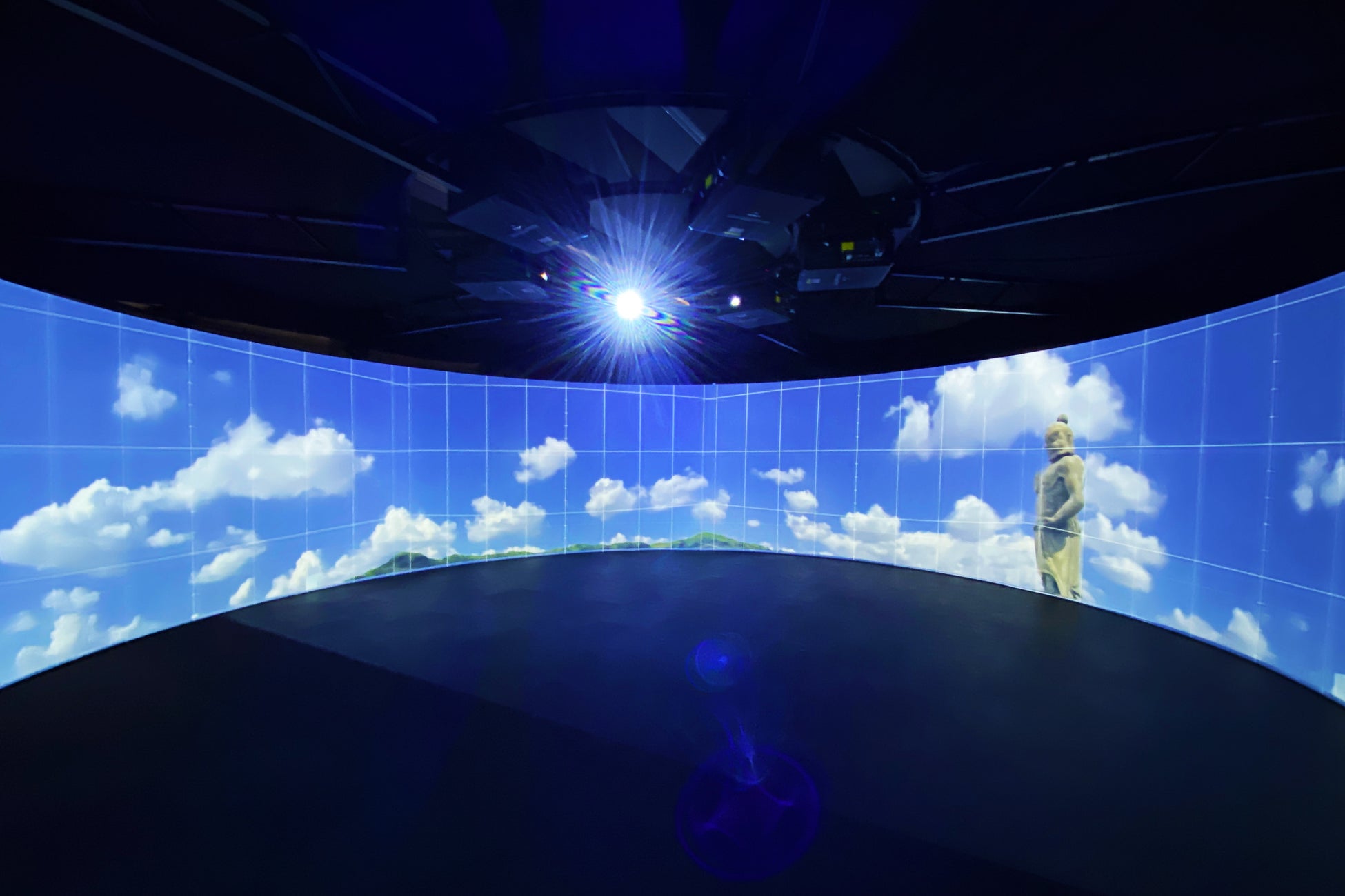 ⾃社開発の純日本製VR空間構築ソフトウェア「moage(モアジ)」(旧オメガスペース)は、HMDだけでなく、プロジェクション、複数⾯モニタや、ハーフミラーホログラムを使⽤する特殊な表⽰装置まで幅広く対応します。