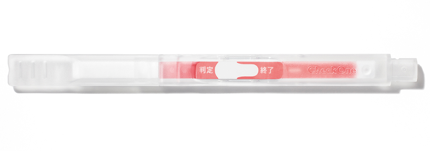 そして、判定ラインの有無を確認する判定窓はボディとの隙間がない一体型とし、不意な尿の侵入を防止するばかりか、鏡面加工も施したうえで、判定・終了ラインは白色背景上に明るい赤色で表示させ、わかりやすい判定結果を実現しました。