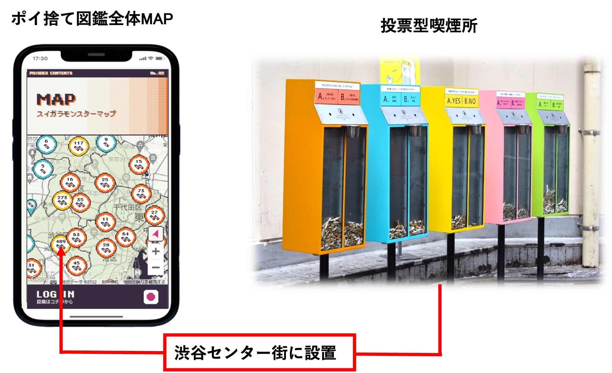 「ポイ捨て図鑑プロジェクト」は、ポイ捨てされた吸殻を“喫煙所に戻れず、迷子になった吸殻モンスター “ といった助けるべき存在として描き、誰もが簡単にゲーム感覚で参加ができるポイ捨て問題の解決を目指すプロジェクトです。ポイ捨てされた吸殻を撮影し、捨てられた位置情報と併せて投稿と拡散を行うことで、街のポイ捨て状況を可視化。2022年6月末時点で約1,800体の投稿が集まっており、ポイ捨てが多いエリアにはTHE TOBACCOによる喫煙所設置等を検討していきます。