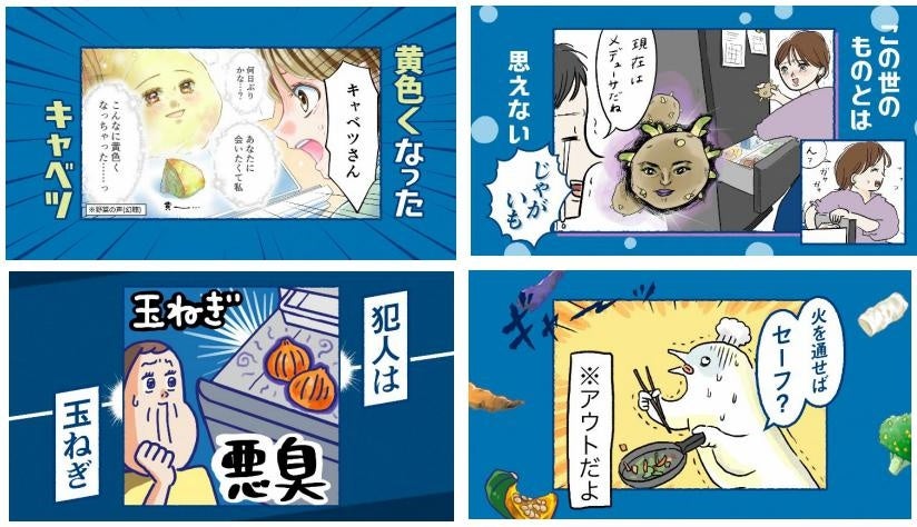 「あるある」と思わず共感してしまう野菜の食品ロス体験談のビジュアルは、SNSで活躍する人気マンガ家4名が今回特別に描き下ろしたマンガの一部をアニメーションにしています。マンガ全編は各マンガ家のSNSアカウントで公開中ですので、そちらもぜひご覧ください。