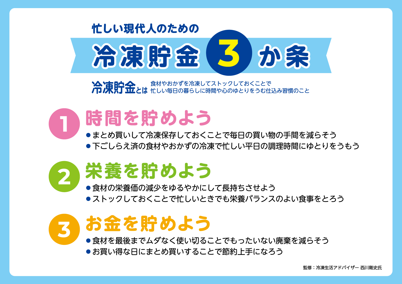 「冷凍貯金ラボ」は、「冷凍貯金」に関する様々な情報の発信母体として、「ゆとりうむプロジェクト」と共同で立ち上げました。時間・栄養・お金が貯められるなどの冷凍保存のメリットと共に、食材やおかずの適切な冷凍保存方法を伝えていくことで、みなさまの家事の負担軽減や忙しい毎日にゆとりを作ることへ貢献していきます。
